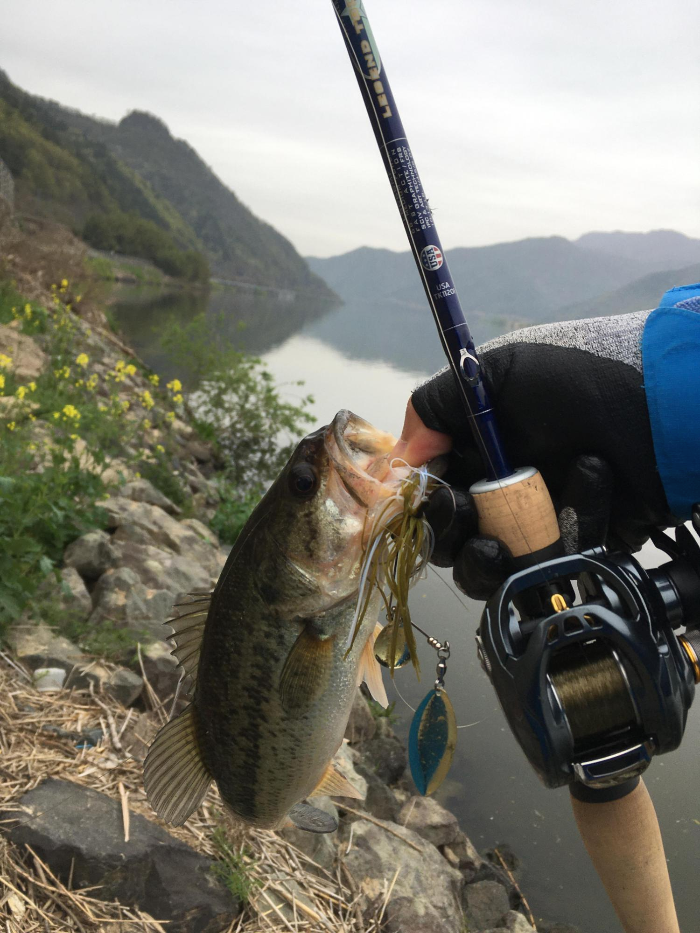 도착하자마자 다시 스피너베이트를 체결한 뒤 좌측 석축 연안을 긁으면서 전방으로 이동하였습니다.
