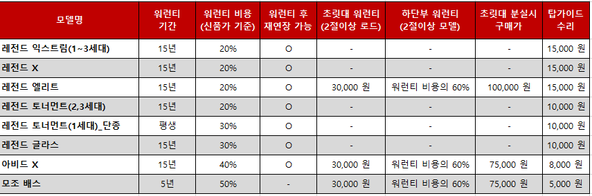 주요 모델 워런티 안내표