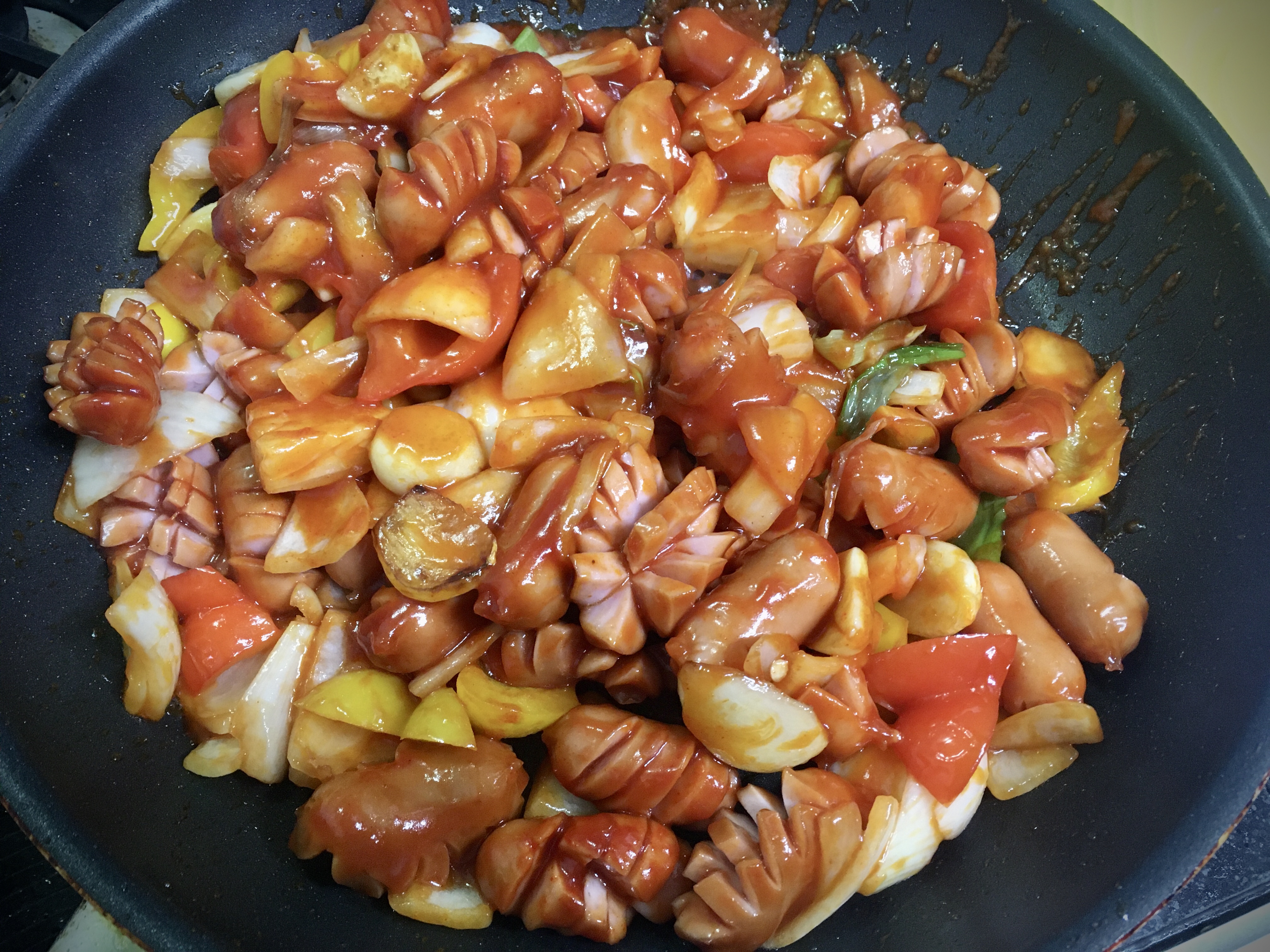 그 다음 나머지 재료(양파, 파프리카, 소시지) 다 넣어준 다음 양념소스도 넣어주세요.