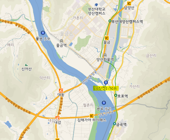 바로 아래 금곡이 6.2도인데 비해 양산천3 하류(호포)는 10.9도입니다.