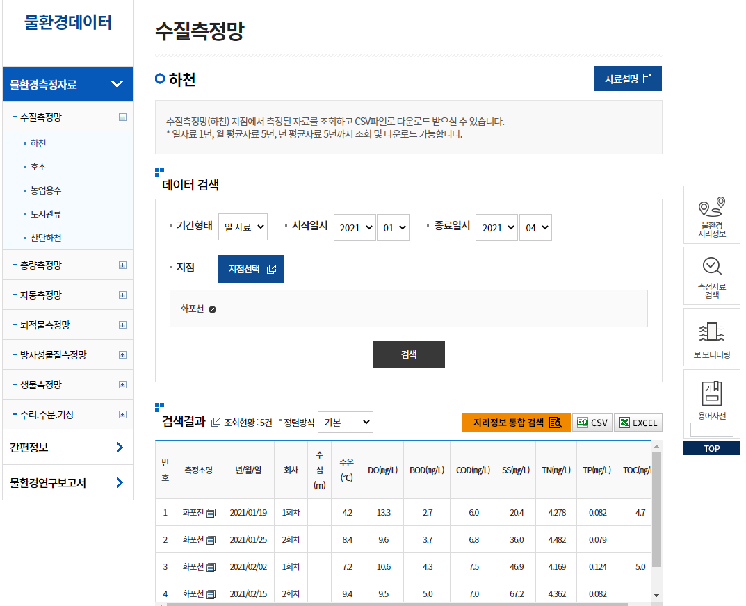 물환경정보시스템 > 물환경데이터 > 물환경측정자료 > 수질측정망 > 하천