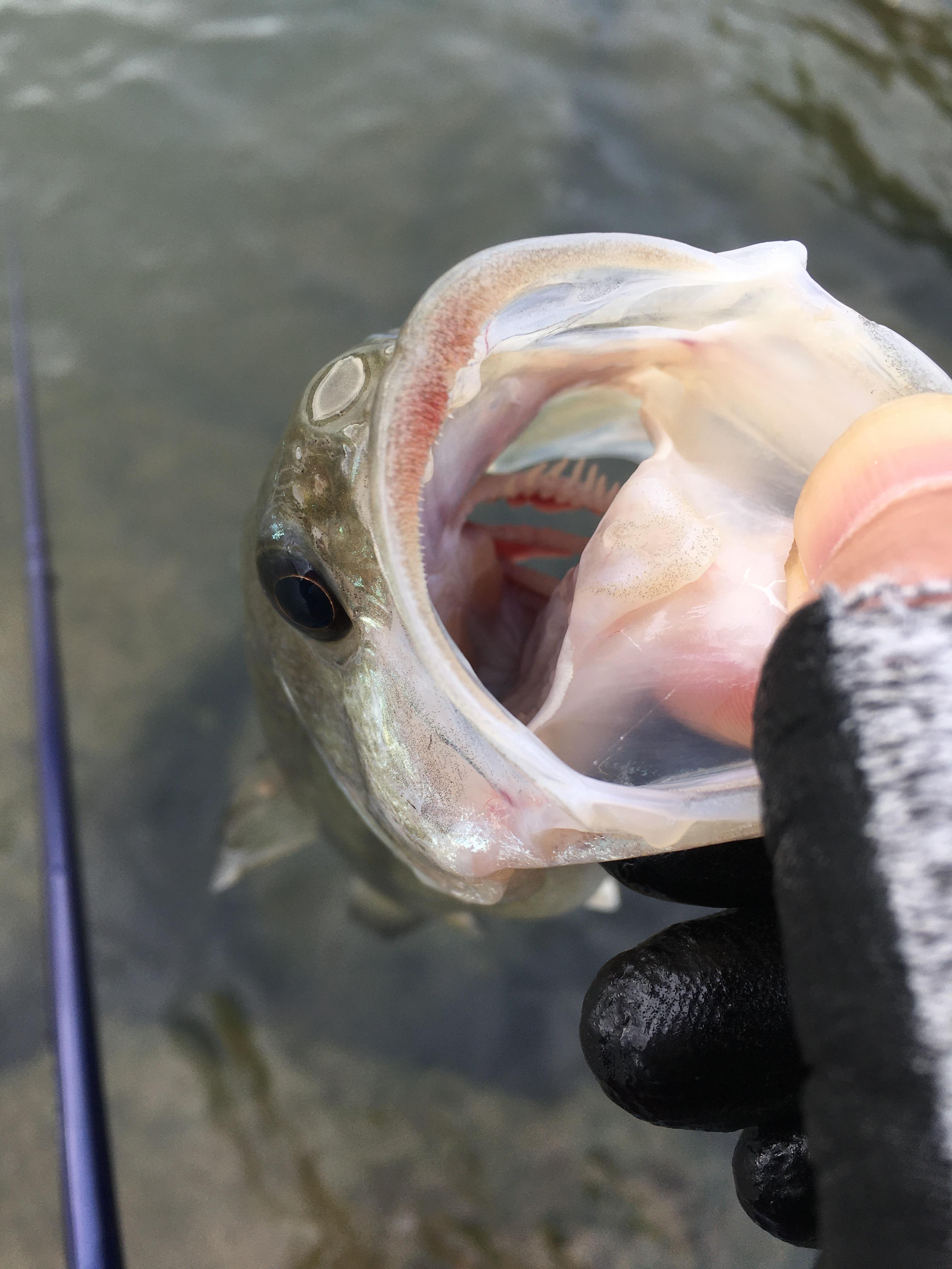 입질을 받고 한참을 더 꼬셔서 훅셋을 했는데도, 바늘이 겨우 걸려 나오네요.