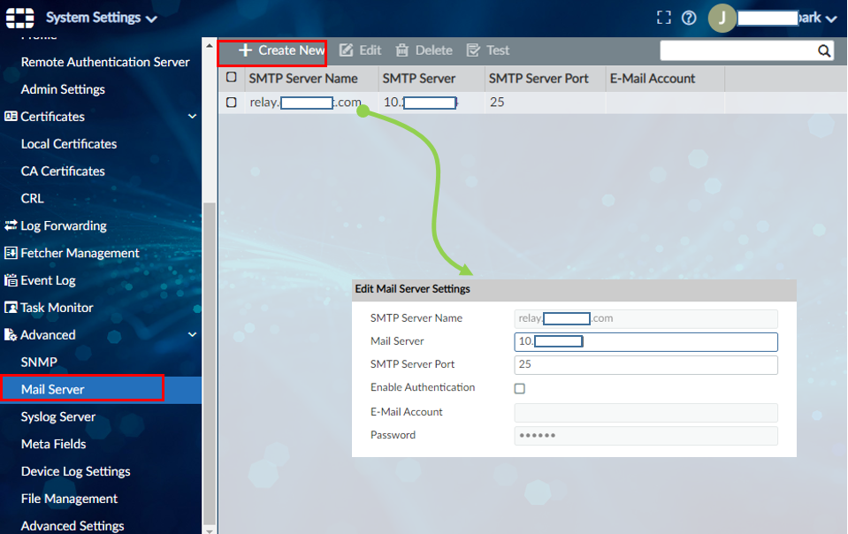System Settings > Advanced > Mail Server 메뉴에서 + Create New 버튼을 클릭하신 후 Mail Server 를 설정해 줍니다.