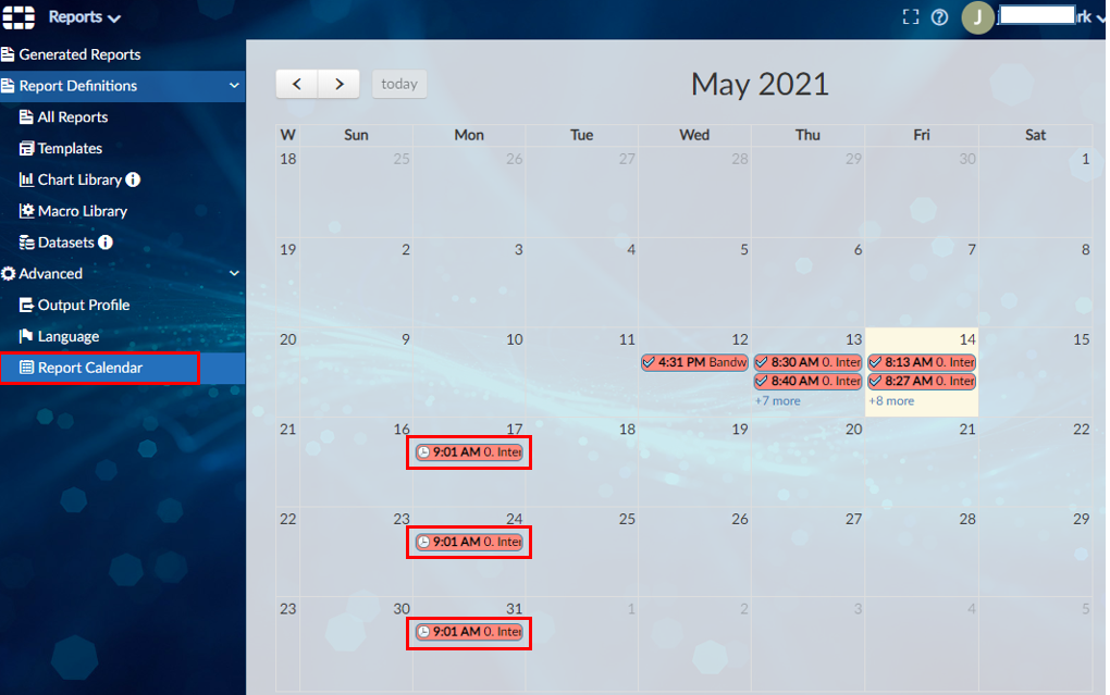 Reports > Advanced > Report Calendar