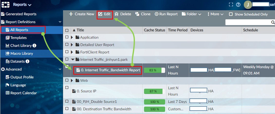 적용할 Report 선택 후 Edit 버튼을 클릭합니다.