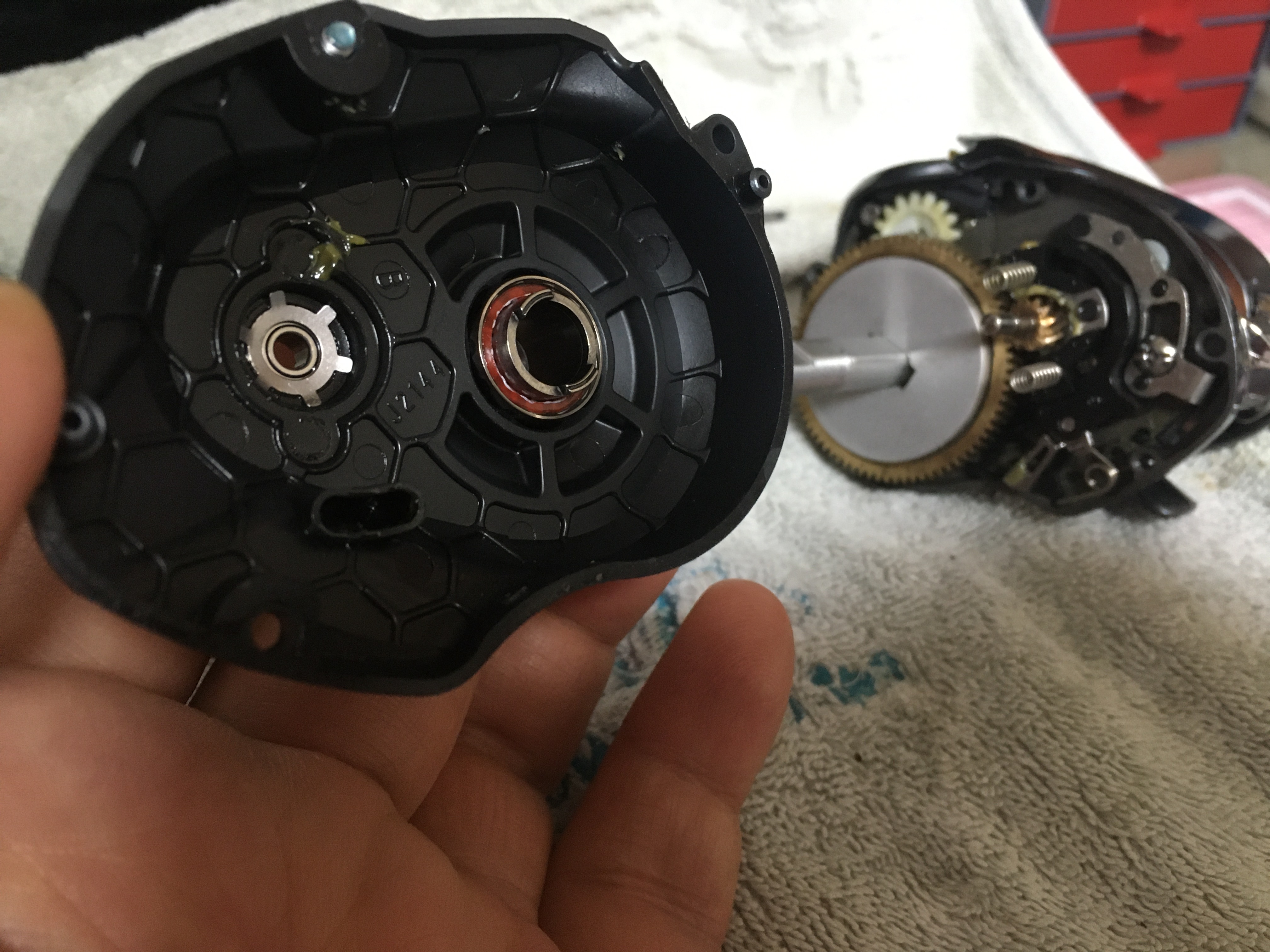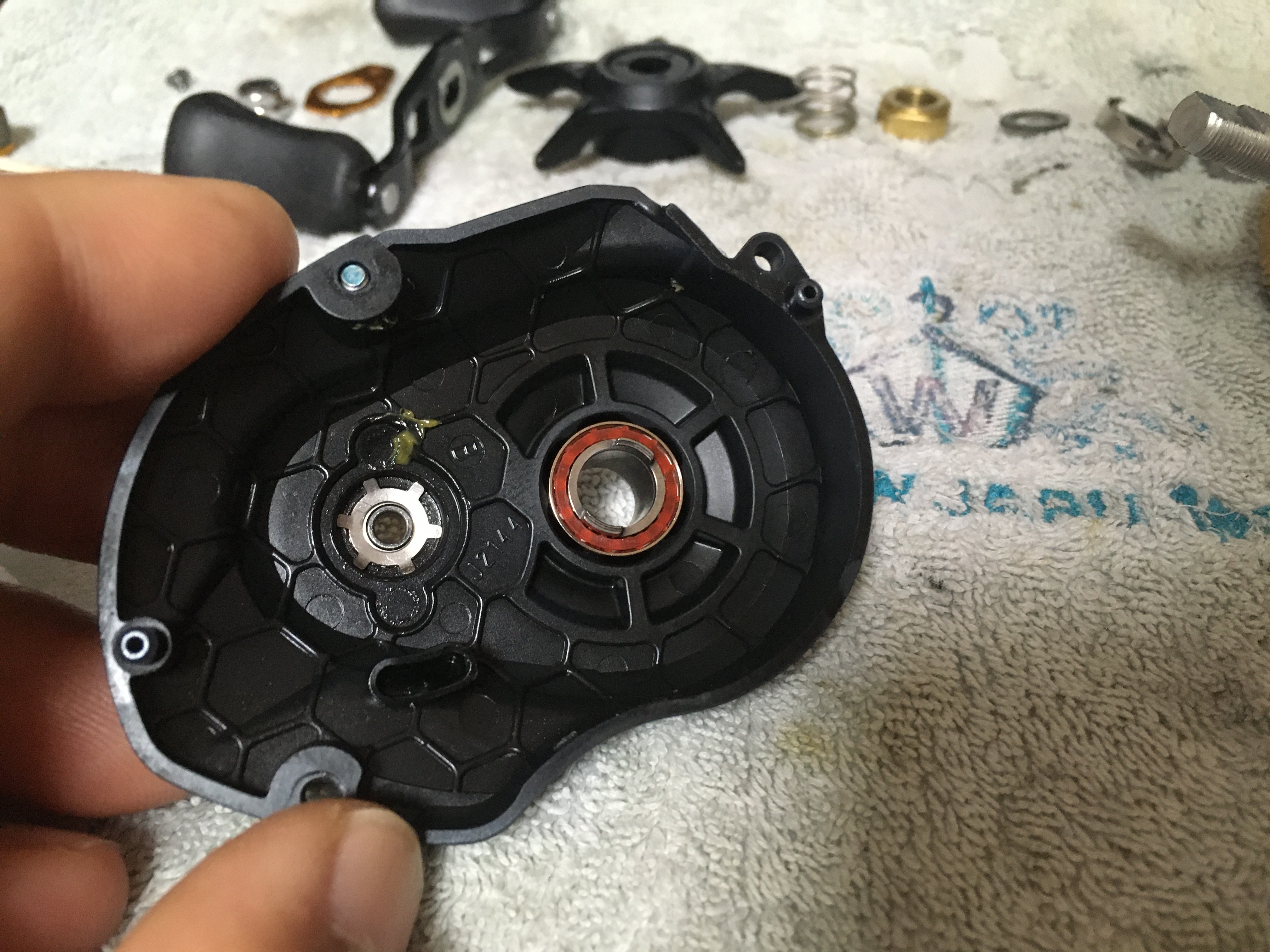 핸들과 스타드랙을 분리하고 구멍을 보니 원웨이베어링에 하얀 구리스가 듬뿍 발라져 있습니다.