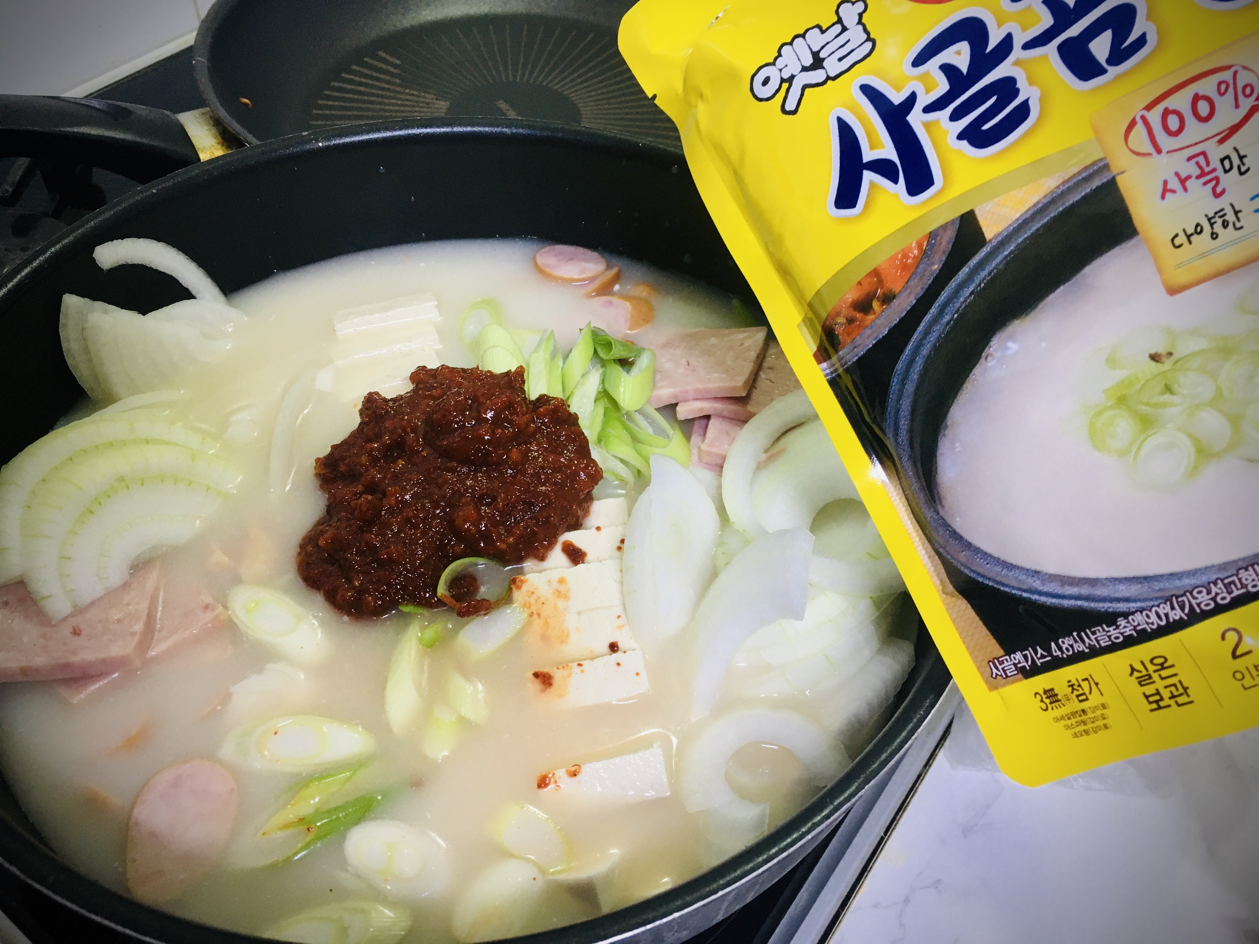 - 필수재료 : 오뚜기 사골곰탕 500g(2팩), 각종햄, 김치(밥1공기), 두부(반모), 양파(1개)