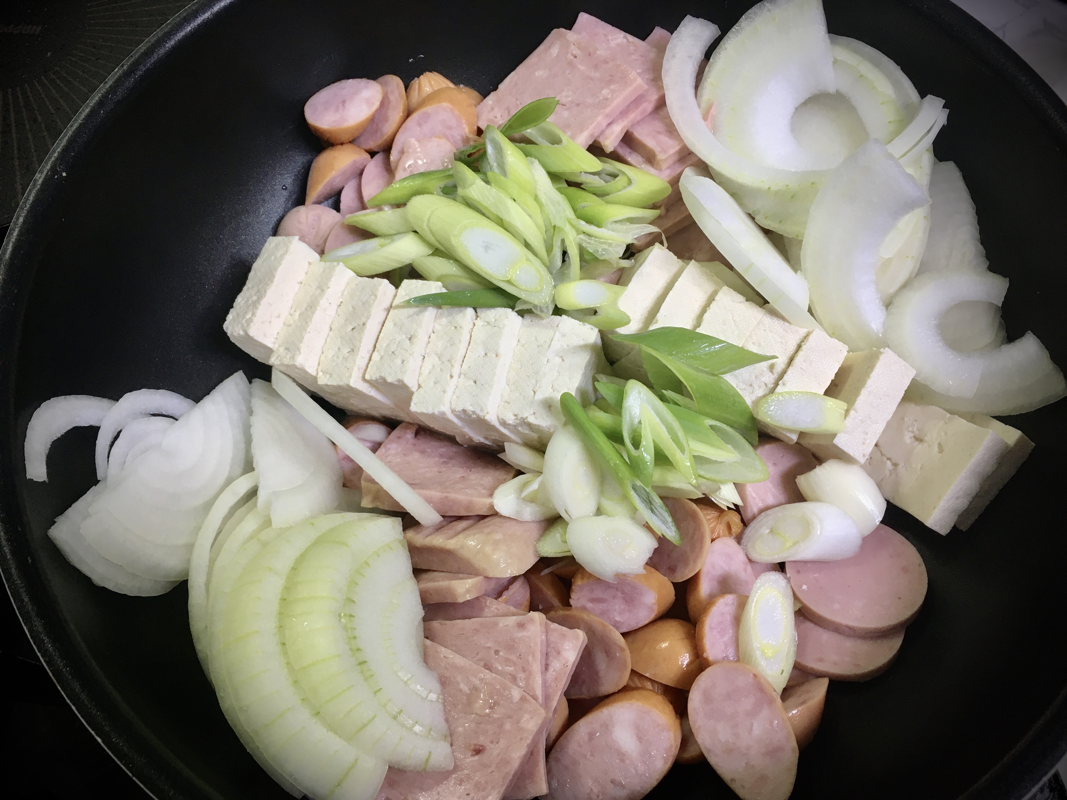 각종 햄과 두부, 양파 모두 적당한 크기로 썰어서 냄비에 담아주세요.