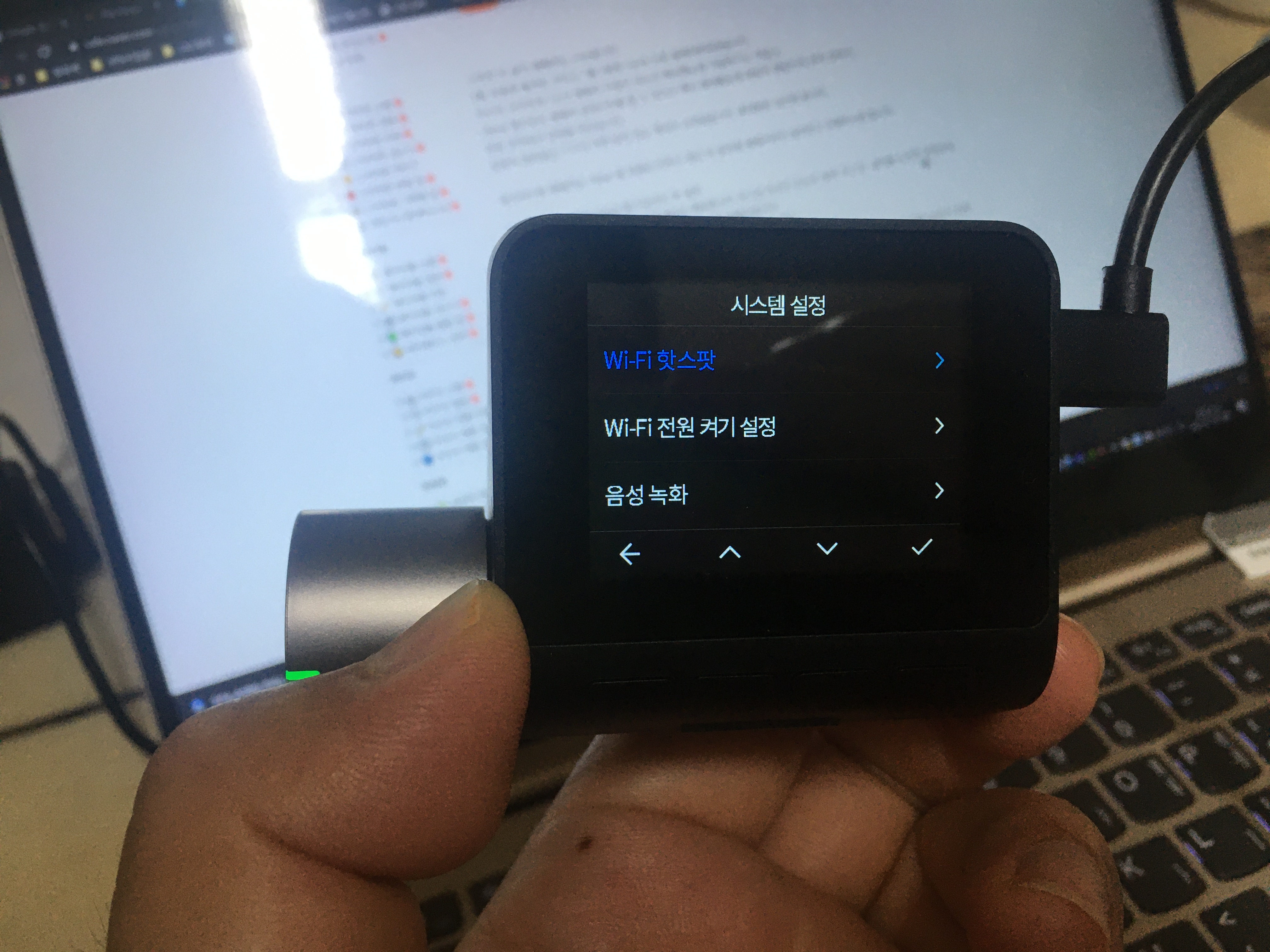 블랙박스 설정에서 와이파이 핫스팟을 켜고, 휴대폰의 Wi-Fi 를 블랙박스 핫스팟에 연결하면 연동이 되는 방식입니다.