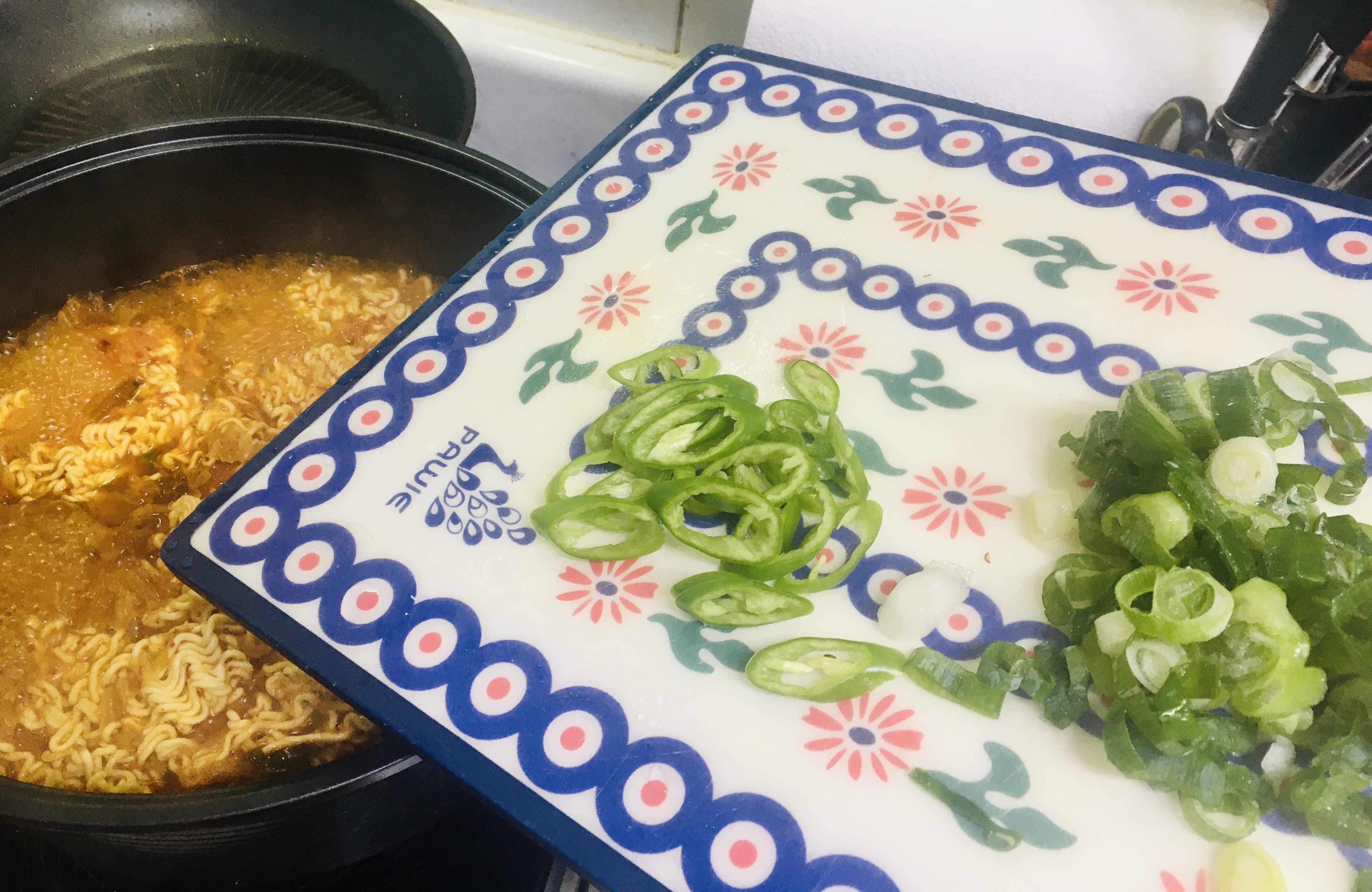 8. 라면이 어느정도 꼬돌꼬돌하게 익으면 대파와 청양고추를 넣어줍니다.