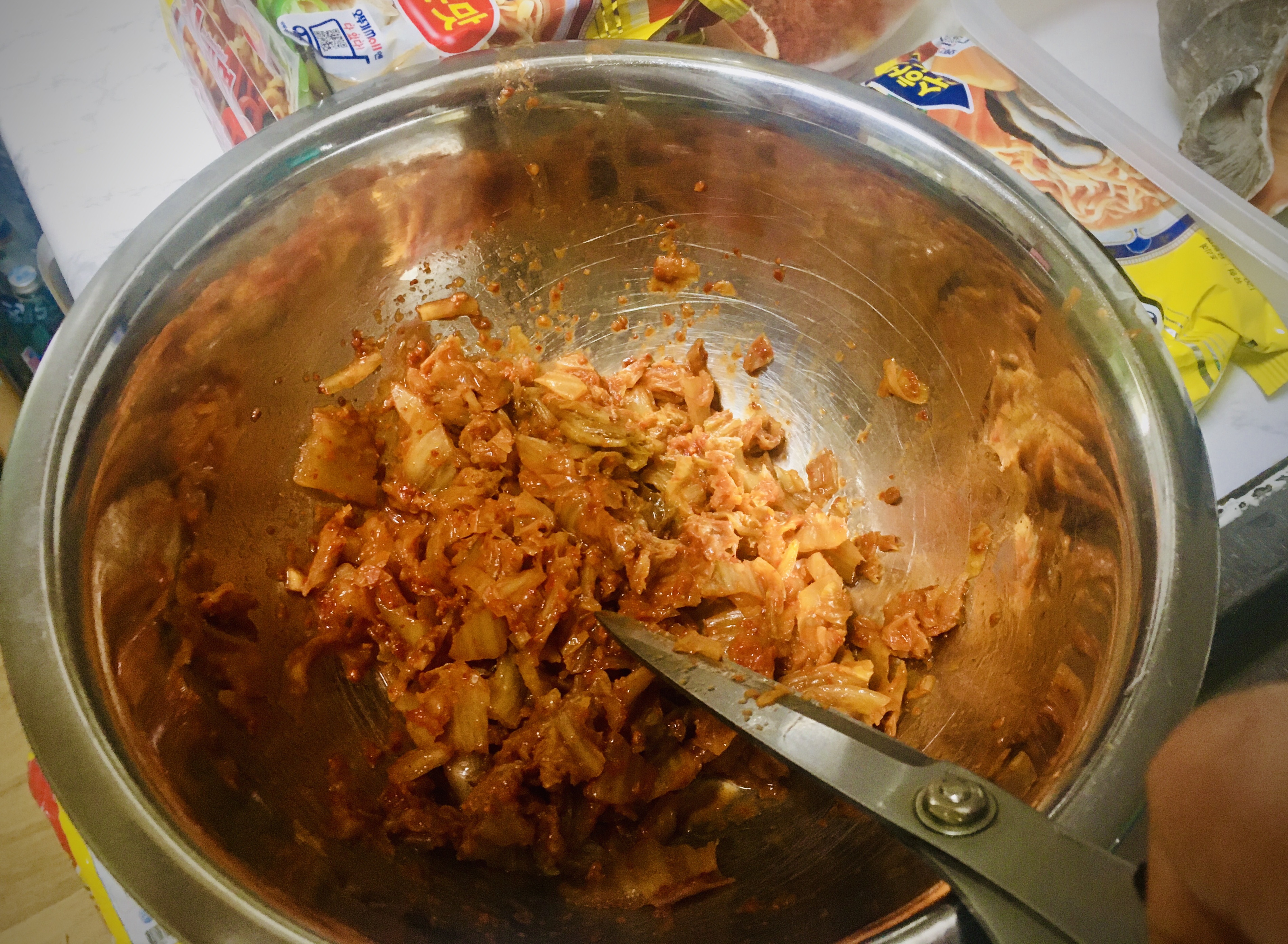 3. 김치는 가위나 칼을 이용해 잘게 싹뚝싹뚝 잘라주세요.