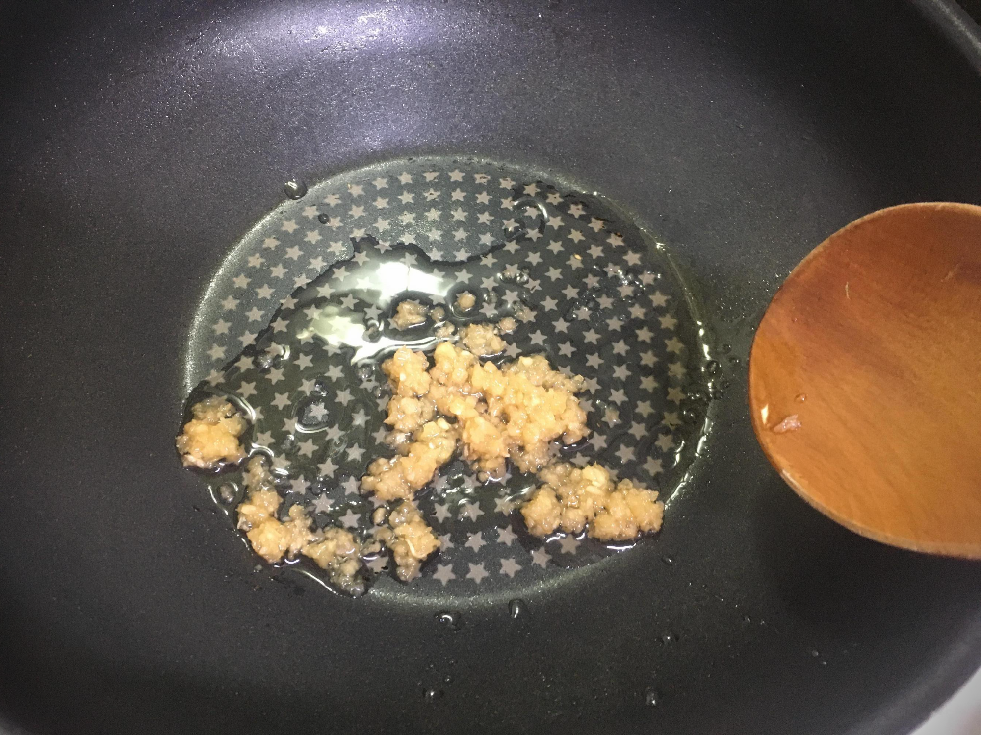 - 먼저 팬에 기름(1)을 두르고 다진 마늘(0.4)를 넣고 약한 불에 볶아 줍니다.