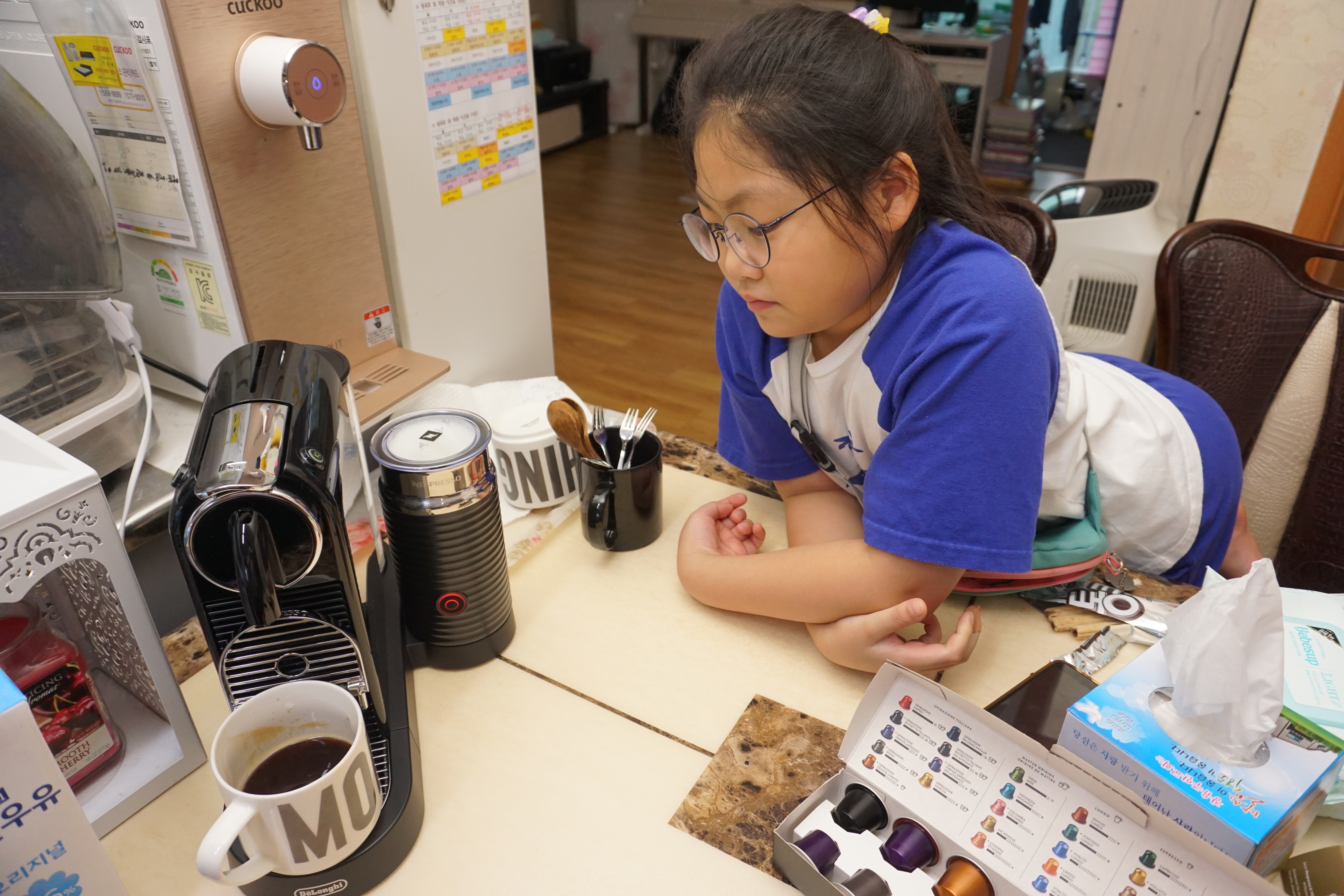 그 뒤 저희 딸이 바로 제티쵸코우유를 타더니, 우유거품을 만들어달라고 하더라구요.