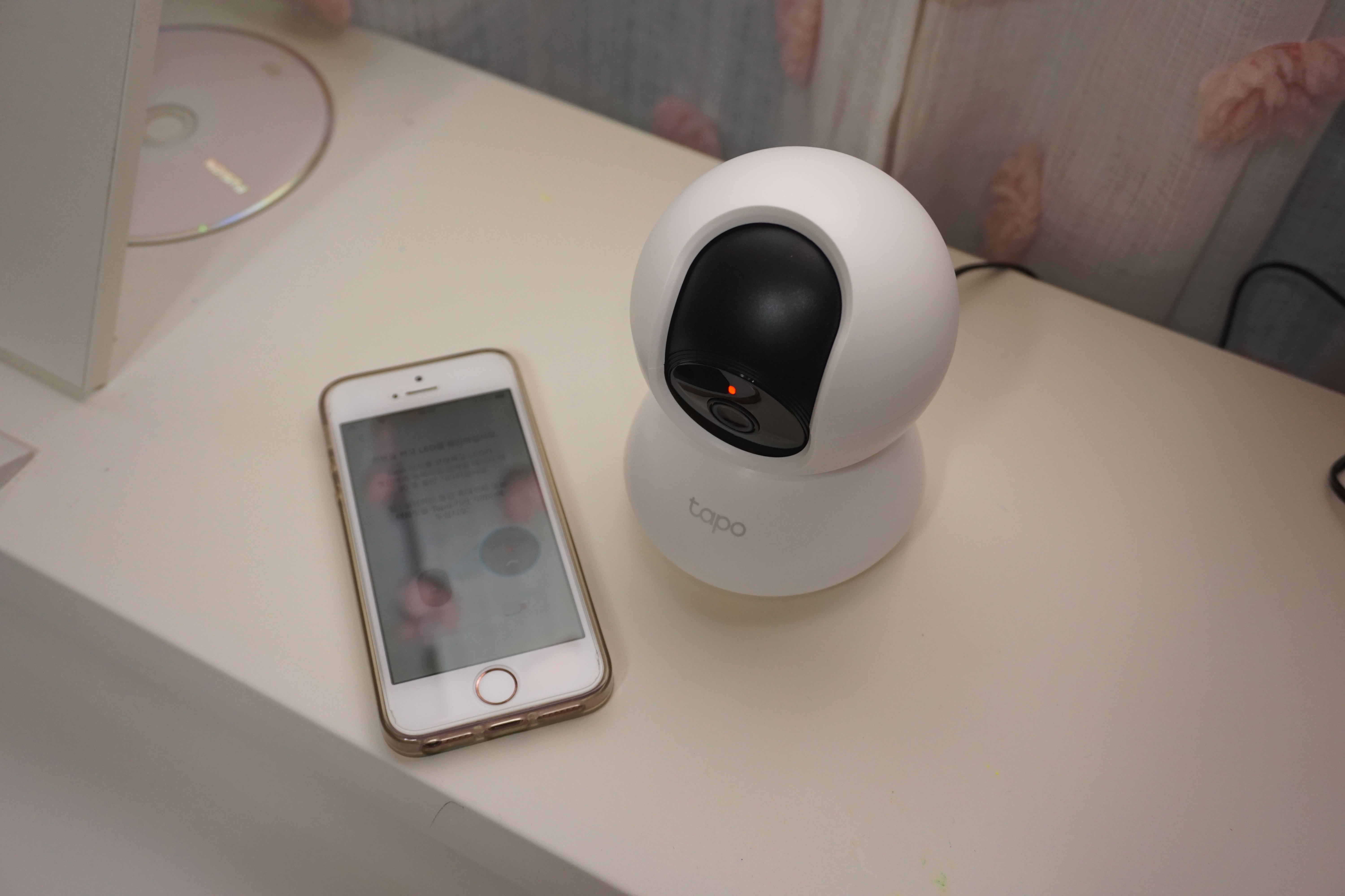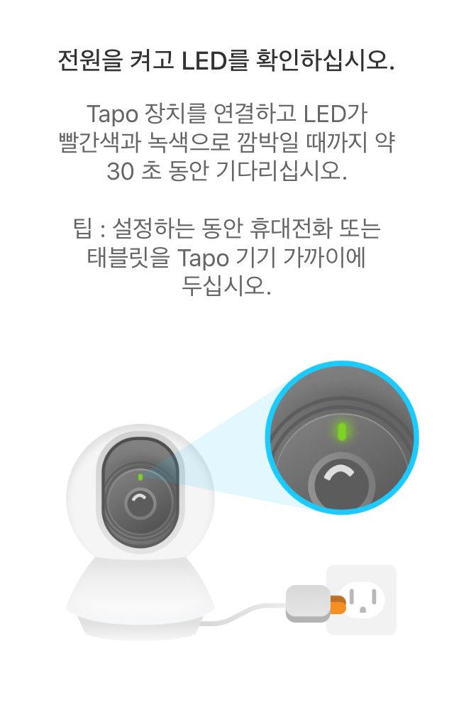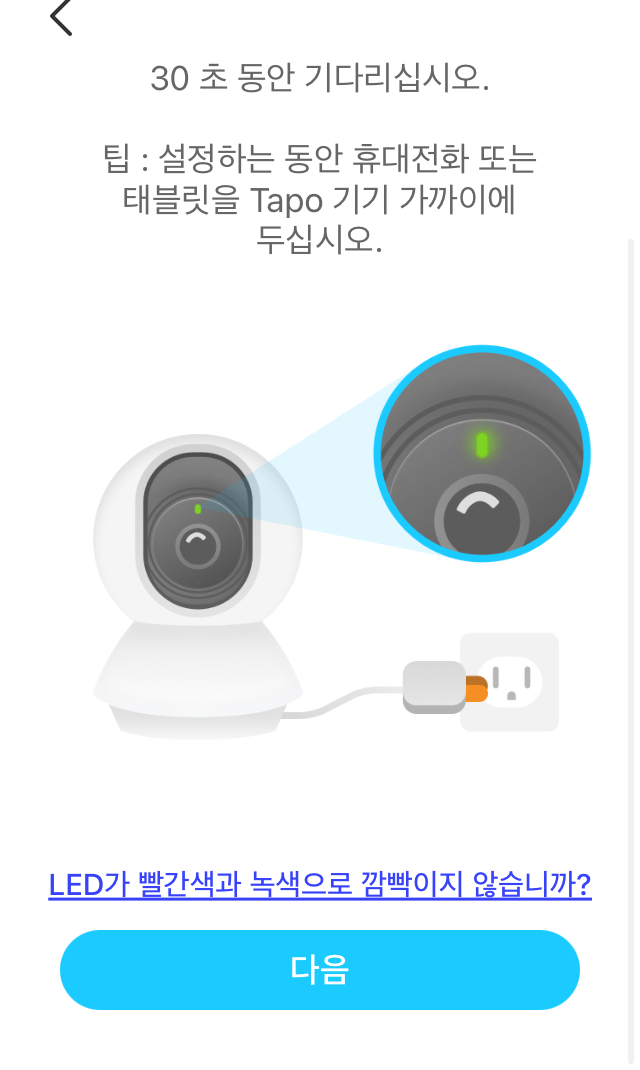 Tapo 어플을 실행 시킨 다음 카메라에 전원을 연결하면 LED 가 적색,녹색 번갈아 점멸합니다.
