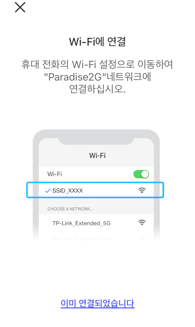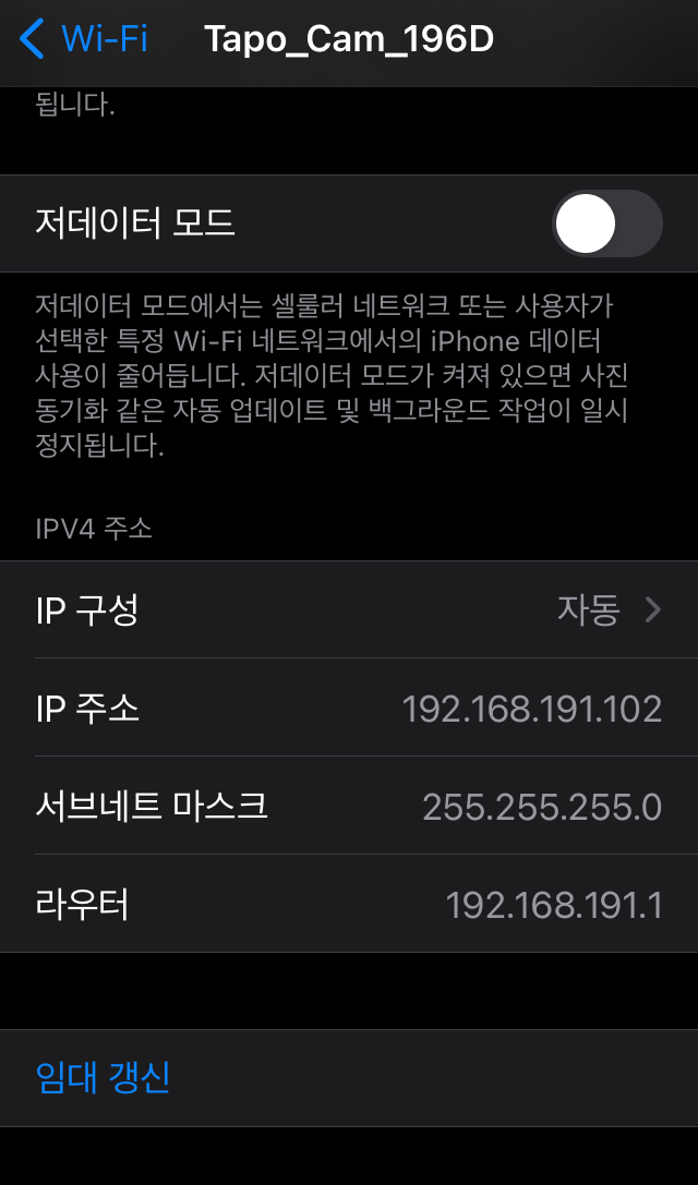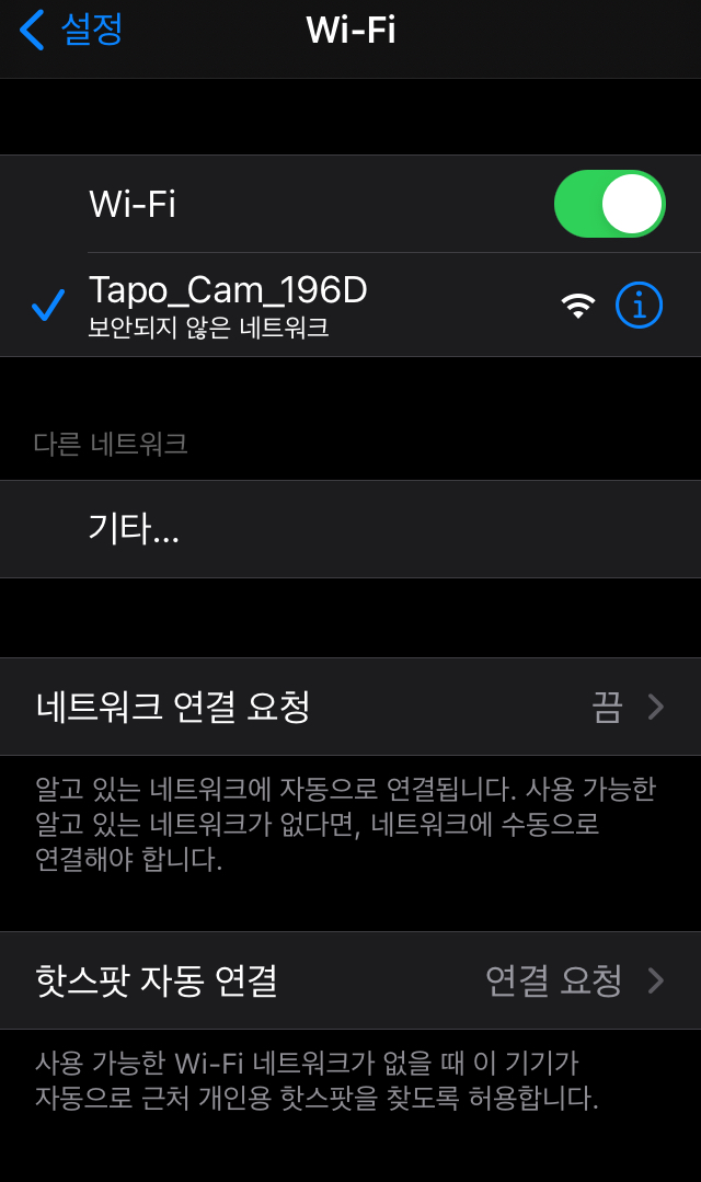 휴대폰 Wi-Fi 목록에 있는 "Tapo_Cam_xxx" 라는 SSID 를 연결합니다.