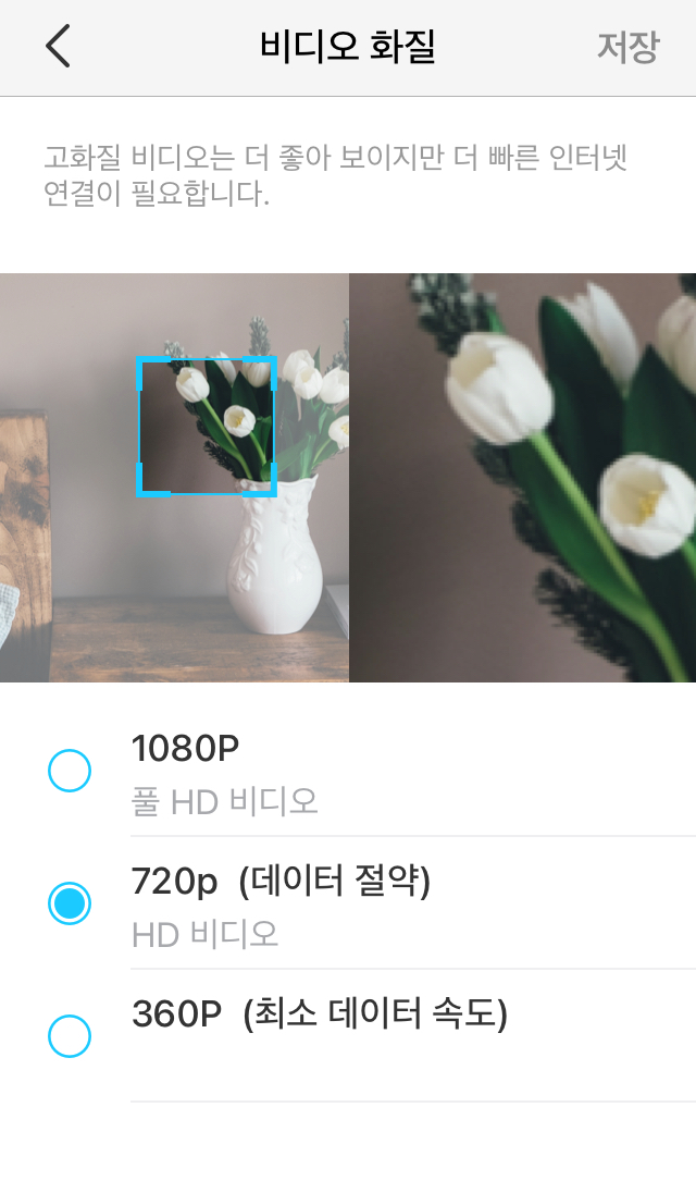 | 비디오 화질 | 1080p, 720p, 360p 의 3가지 화질 설정이 가능하며, 인터넷 환경이 좋지 않을 경우 저화질로 설정 (기본은 720p) |