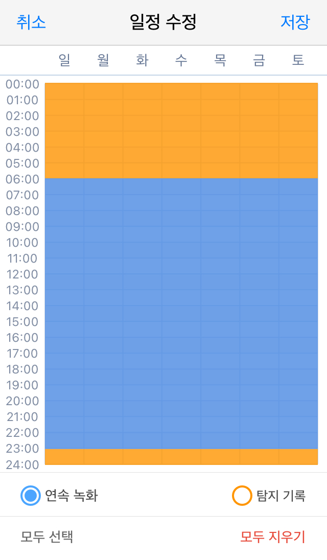 24시간 탐지 녹화를 할 수도 있고, 녹화가 필요 없는 시간대에는 "녹화 금지" 설정을 할 수도 있습니다.