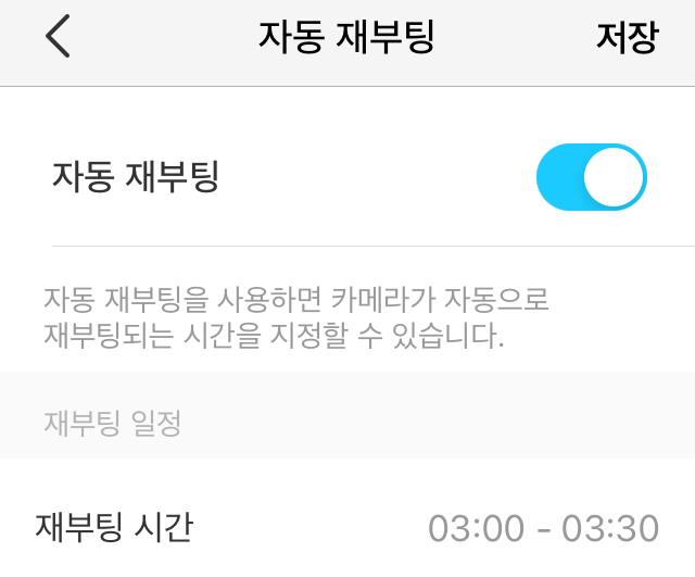 | 자동 재부팅 | 카메라가 자동으로 재부팅되도록 설정할 수 있으며, 시간 설정만 가능하고 요일 설정은 불가 (주말에만 재부팅 등의 설정은 불가능) |