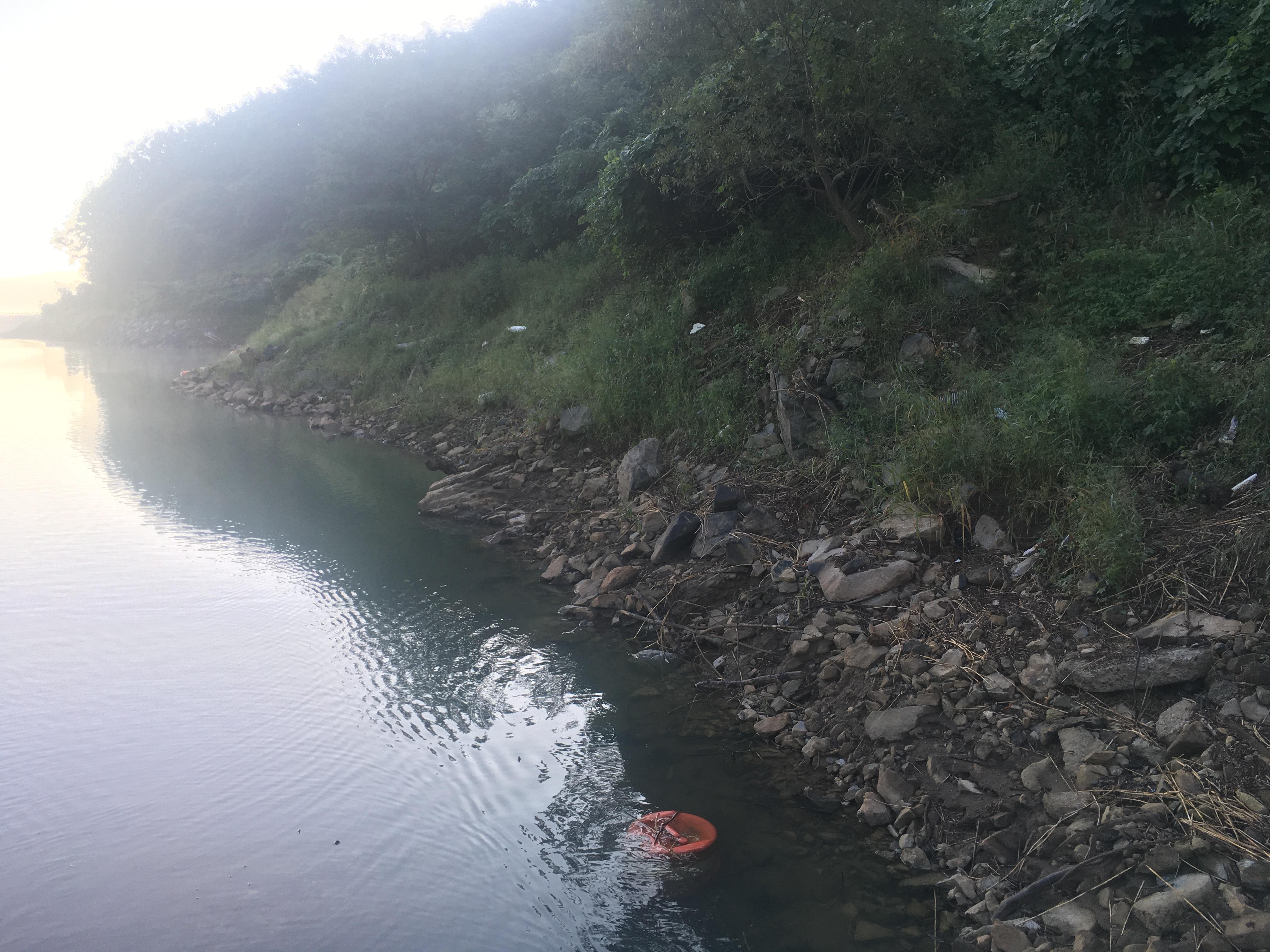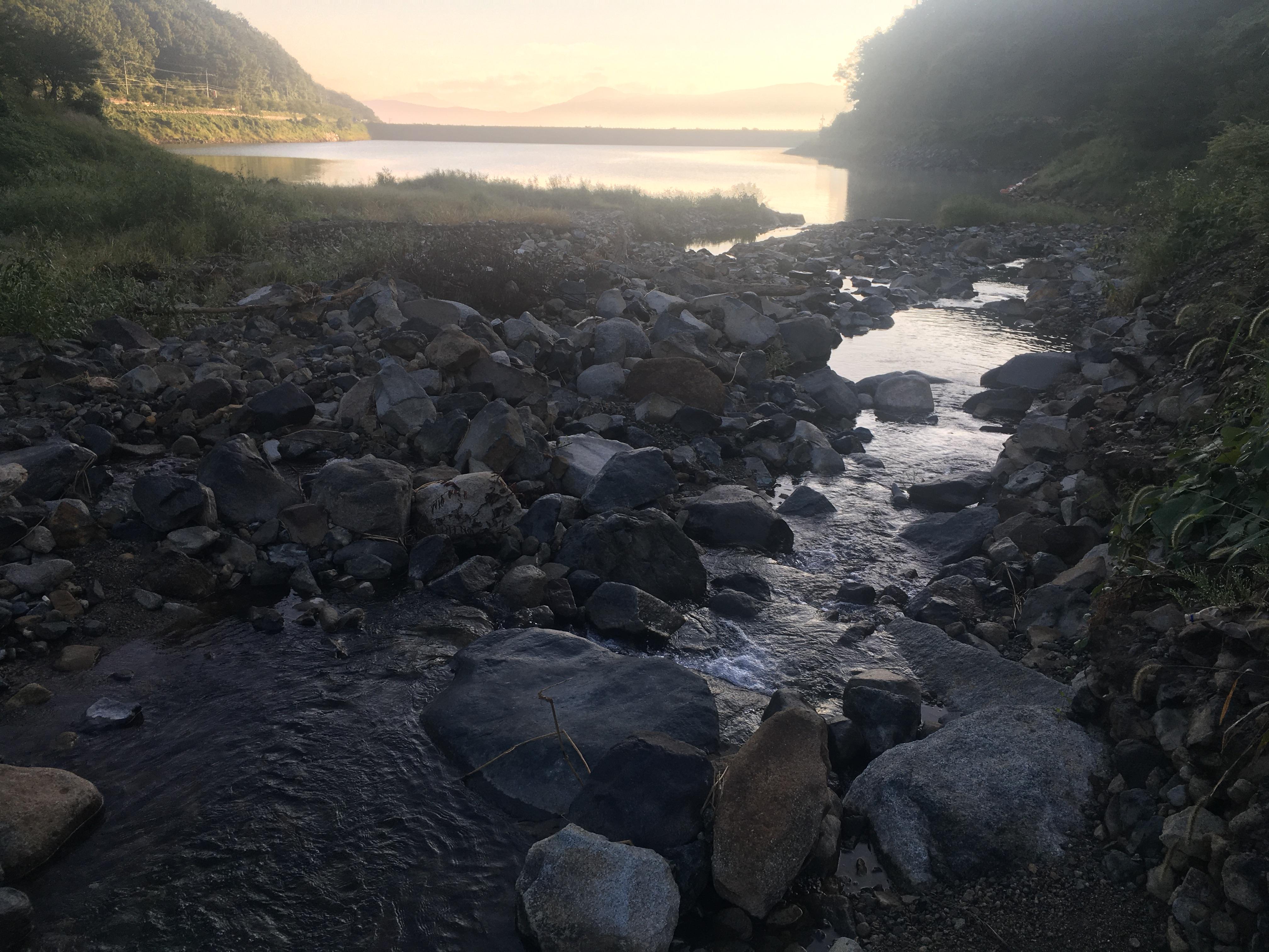하류 방향 산쪽에 돌무더기가 있는 곳으로 위치를 옮겼습니다.