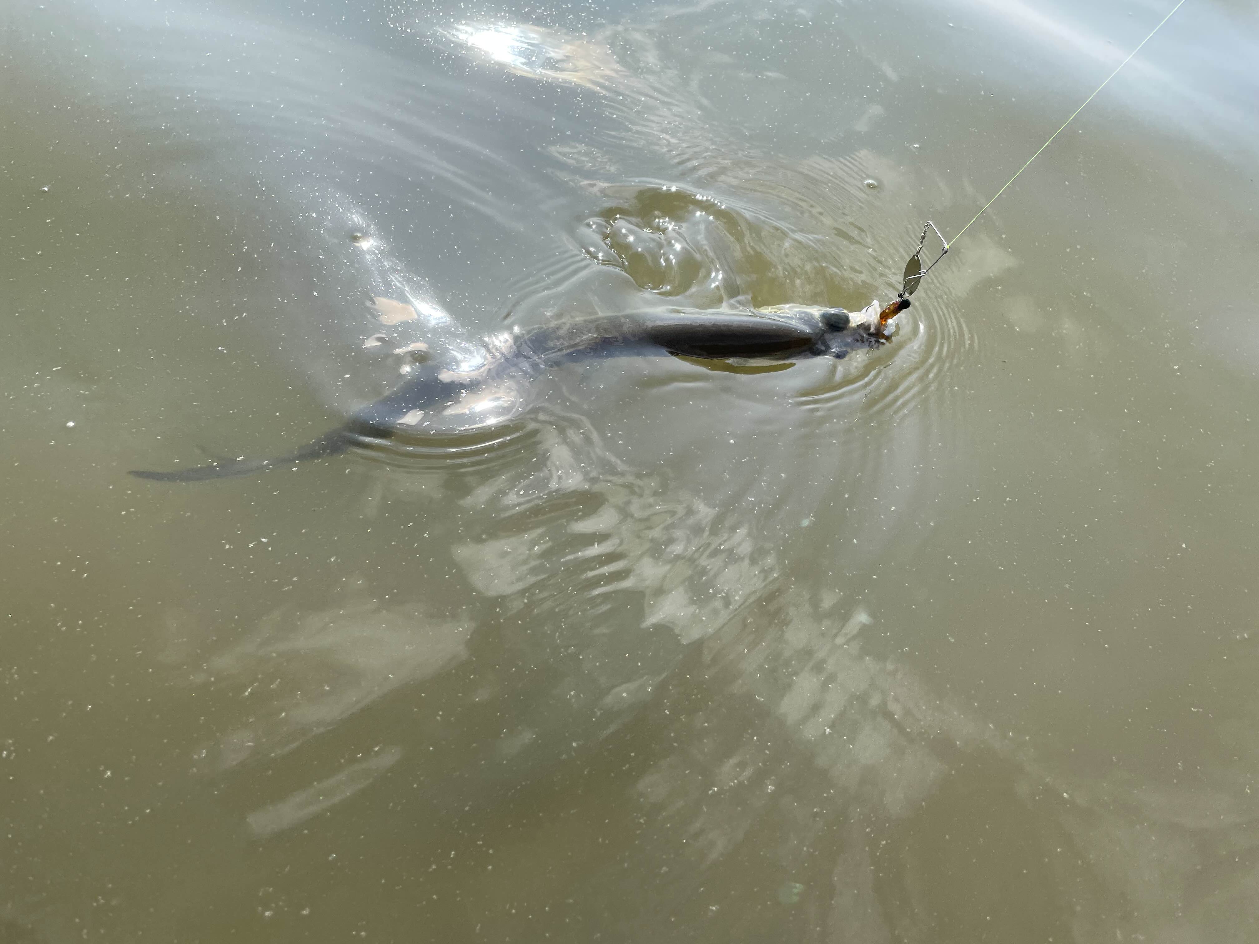베이트피네스 로드에 지그스피너 채비로 빠르게 훑어보면서 이동하는데 들어온 바이트!