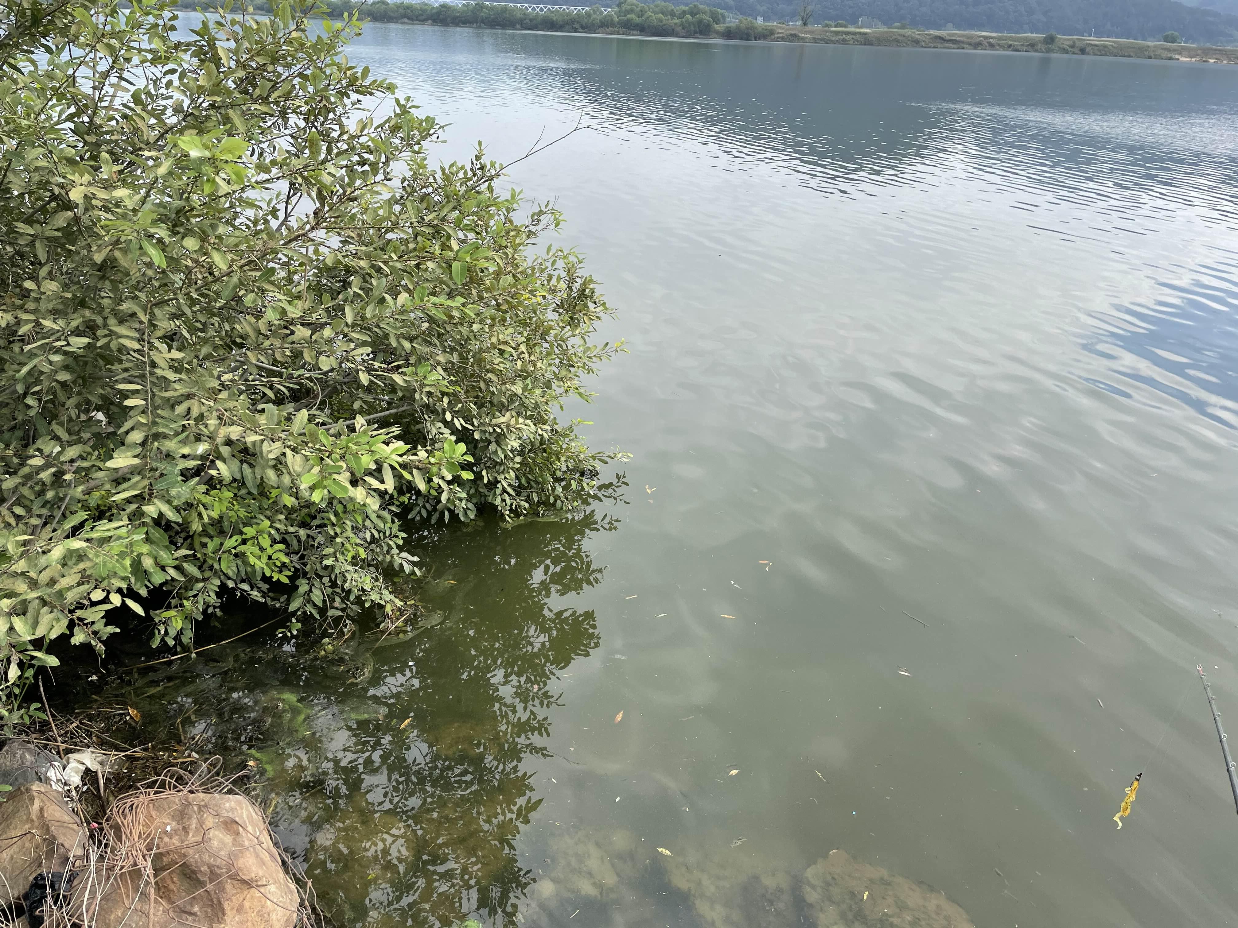 일단 건너편 새물 옆에 보이는 나무 가까이 탑워터를 제일 먼저 던져 봅니다.