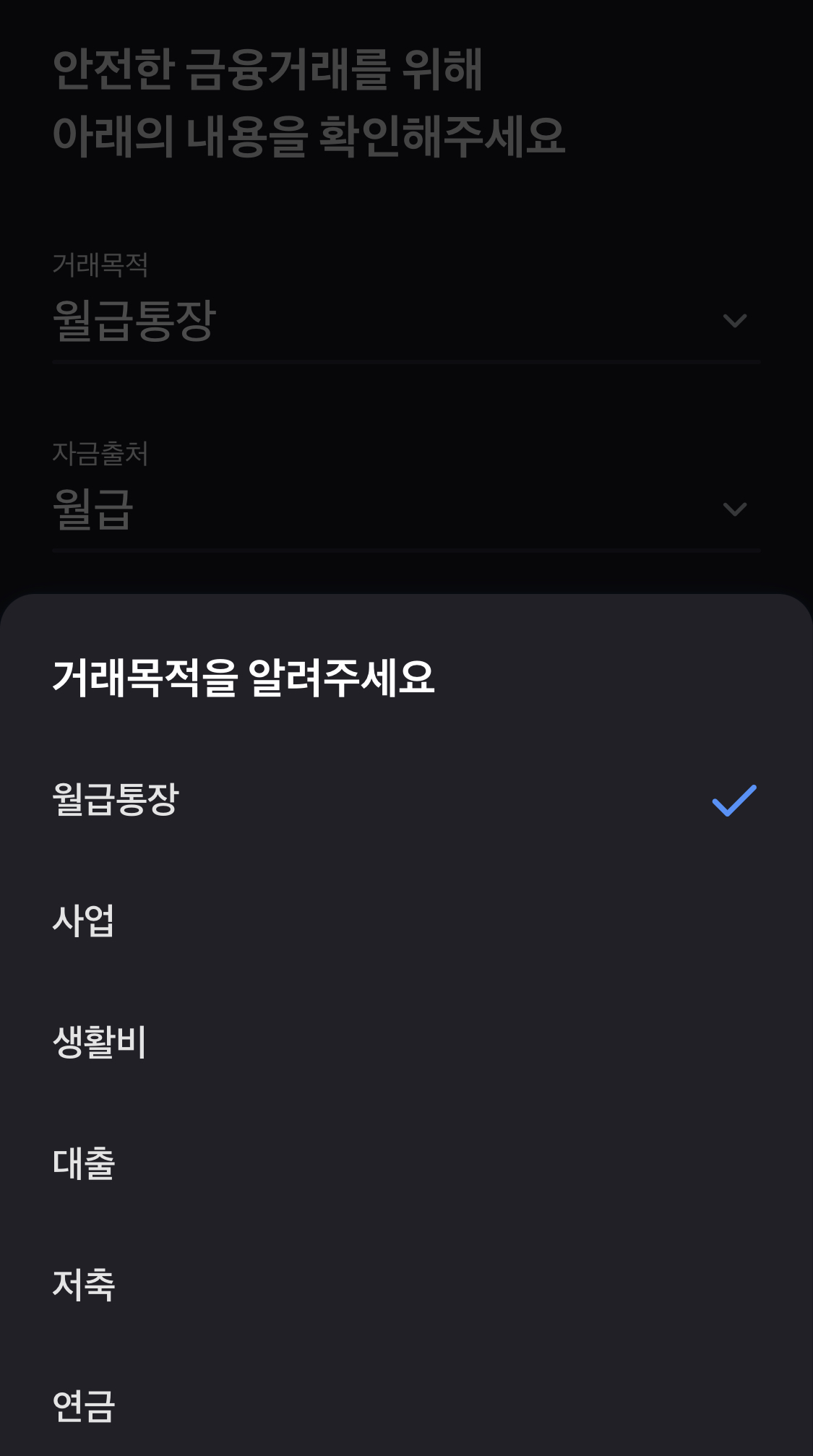 직장정보와 거래목적, 비밀번호를 입력합니다.