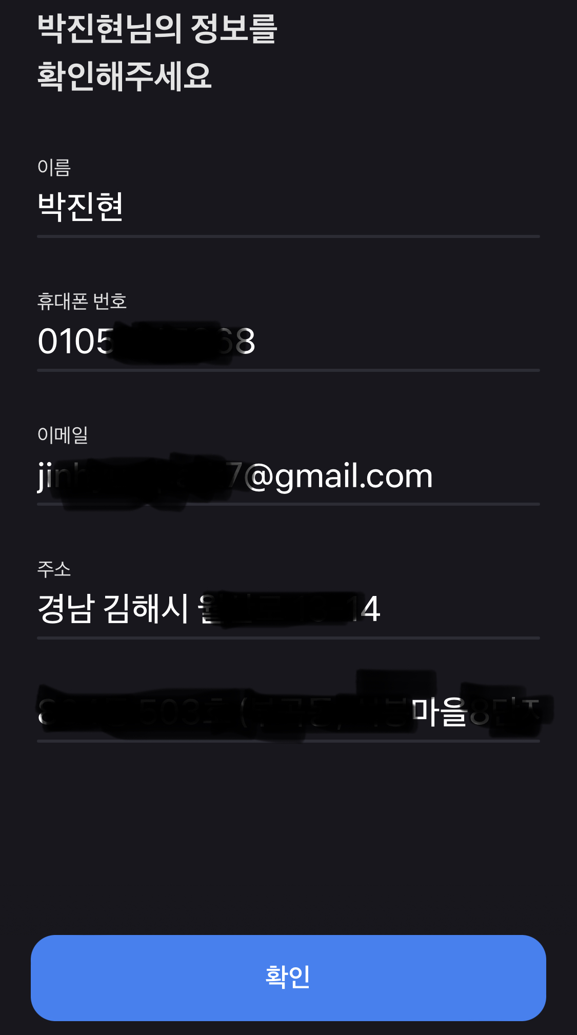 약관 동의 후 메일 주소를 입력하고 본인 정보를 확인합니다.