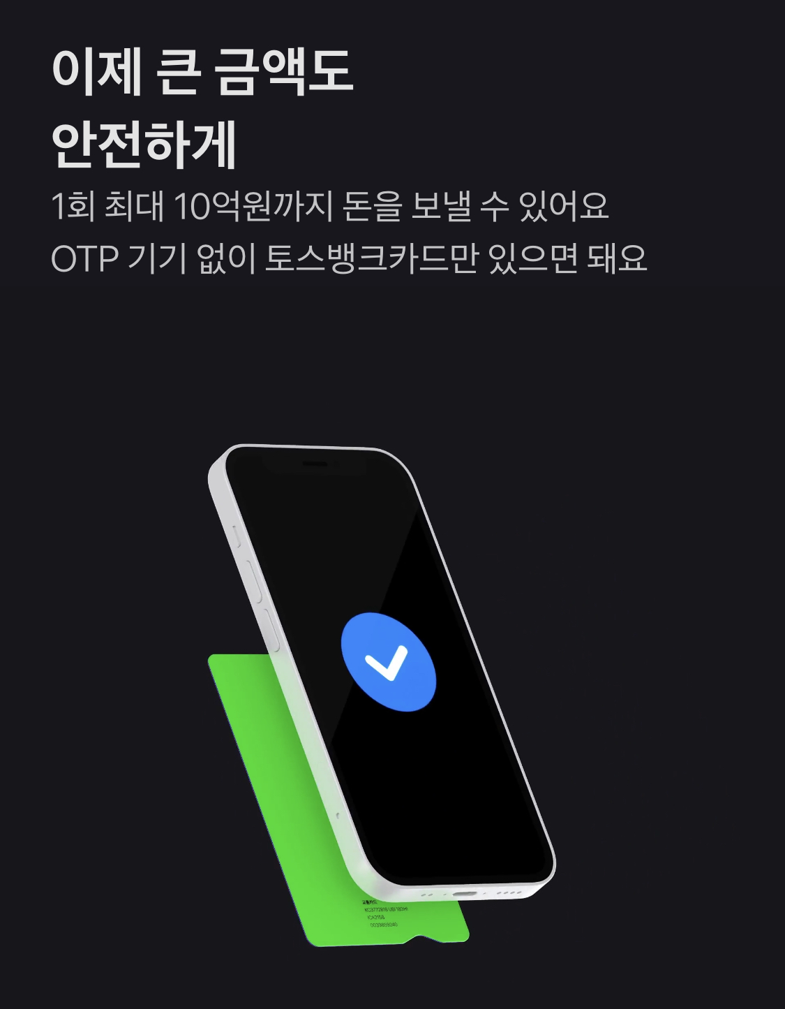 - OTP 없이 토스뱅크카드만 있으면 최대 10억까지 송금