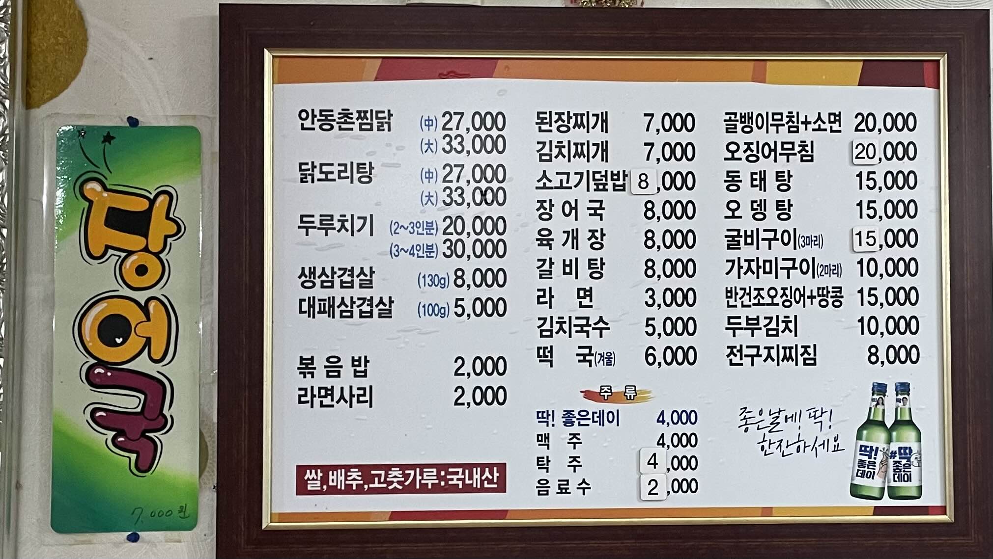 메뉴는 닭과 돼지요리, 찌개류 뿐만 아니라 각종 안주류 등 다양하게 판매하고 있습니다.