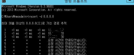 목적지까지의 경로 중 어디까지 통신이 되는지 확인하기 위해 tracert 실행