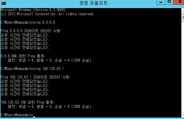 구글 DNS(8.8.8.8) 와 KT DNS(168.126.63.1) 로 ping 테스트를 먼저 시도