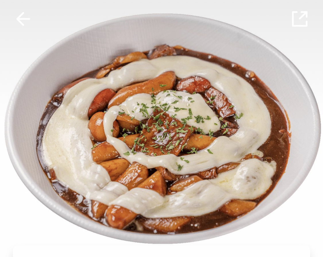 속재료는 떡, 비엔나소시지, 치즈떡, 스파게티면, 메추리알, 베이컨, 치즈 등 다양하게 들어가 있고