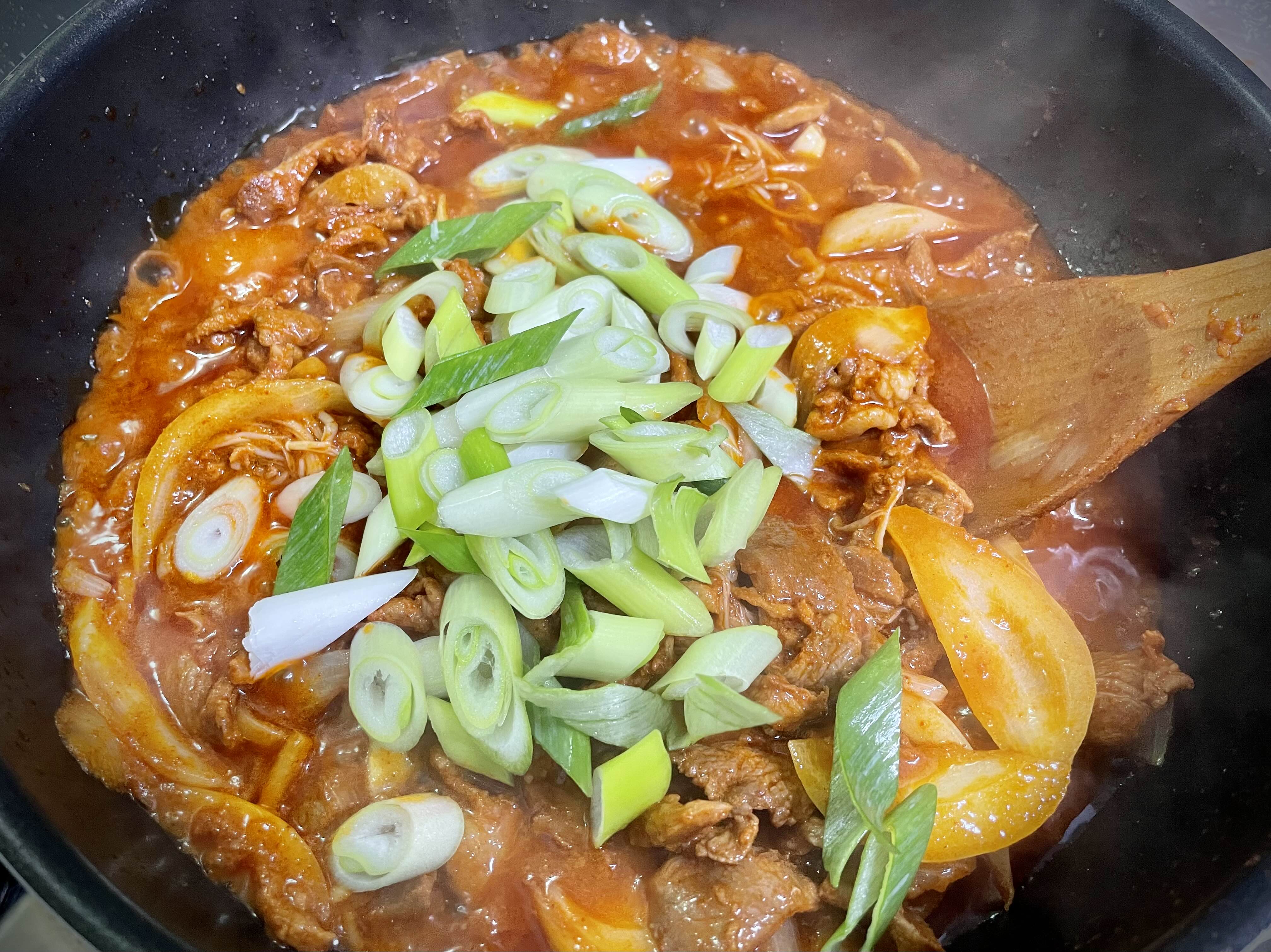 고기가 거의 다 익었다 싶으면 대파를 넣고 조금 더 익혀 줍니다.