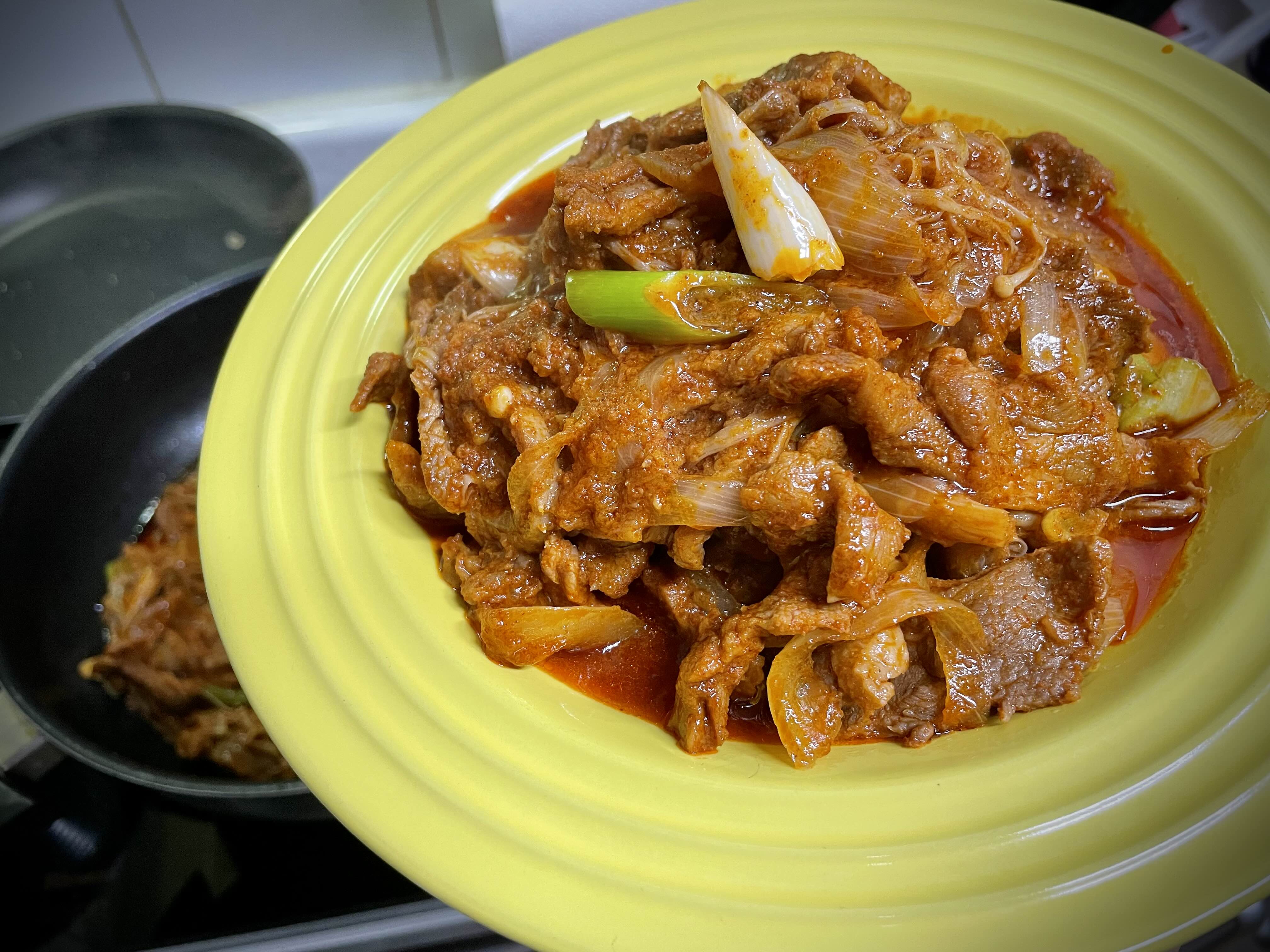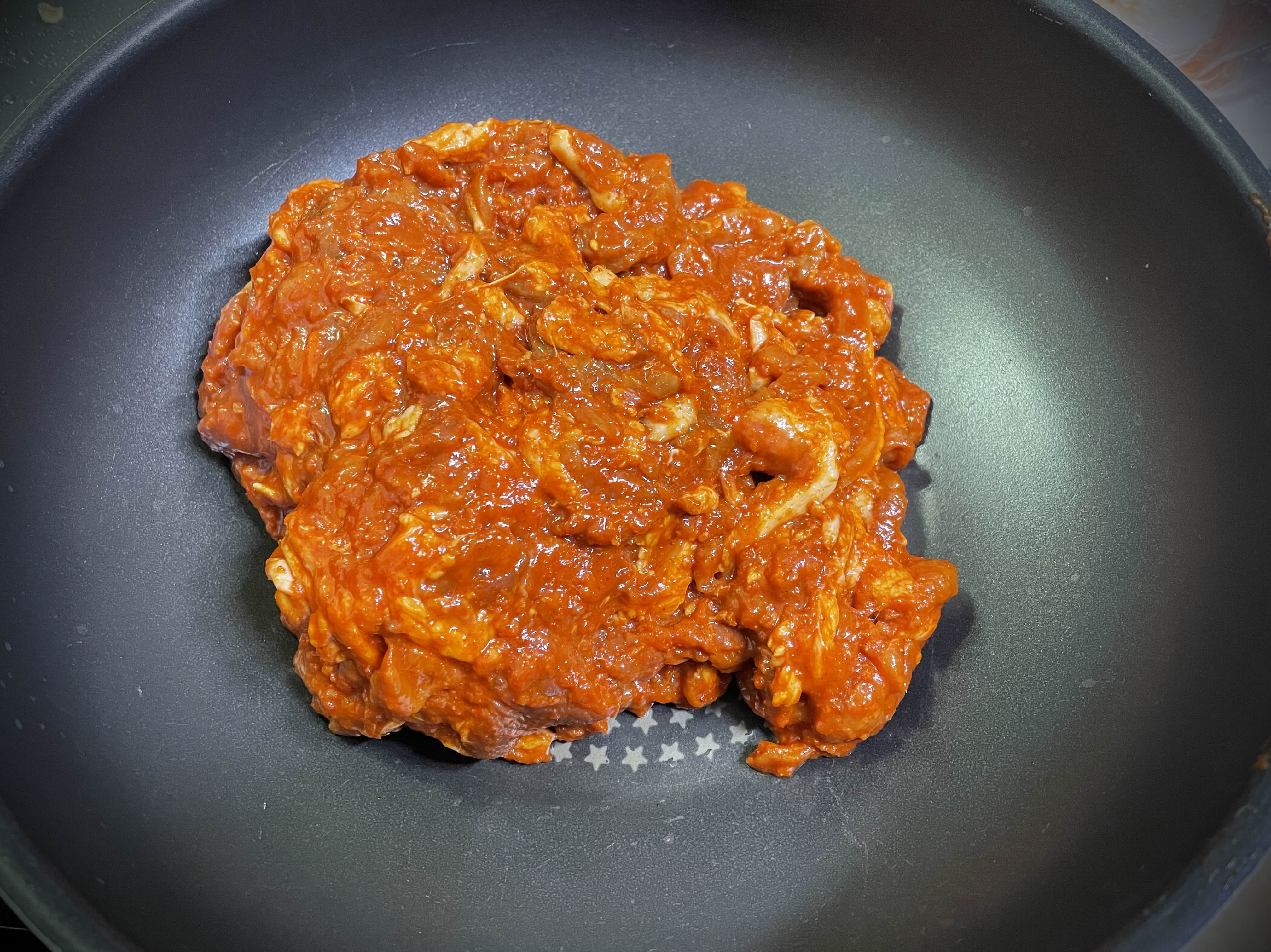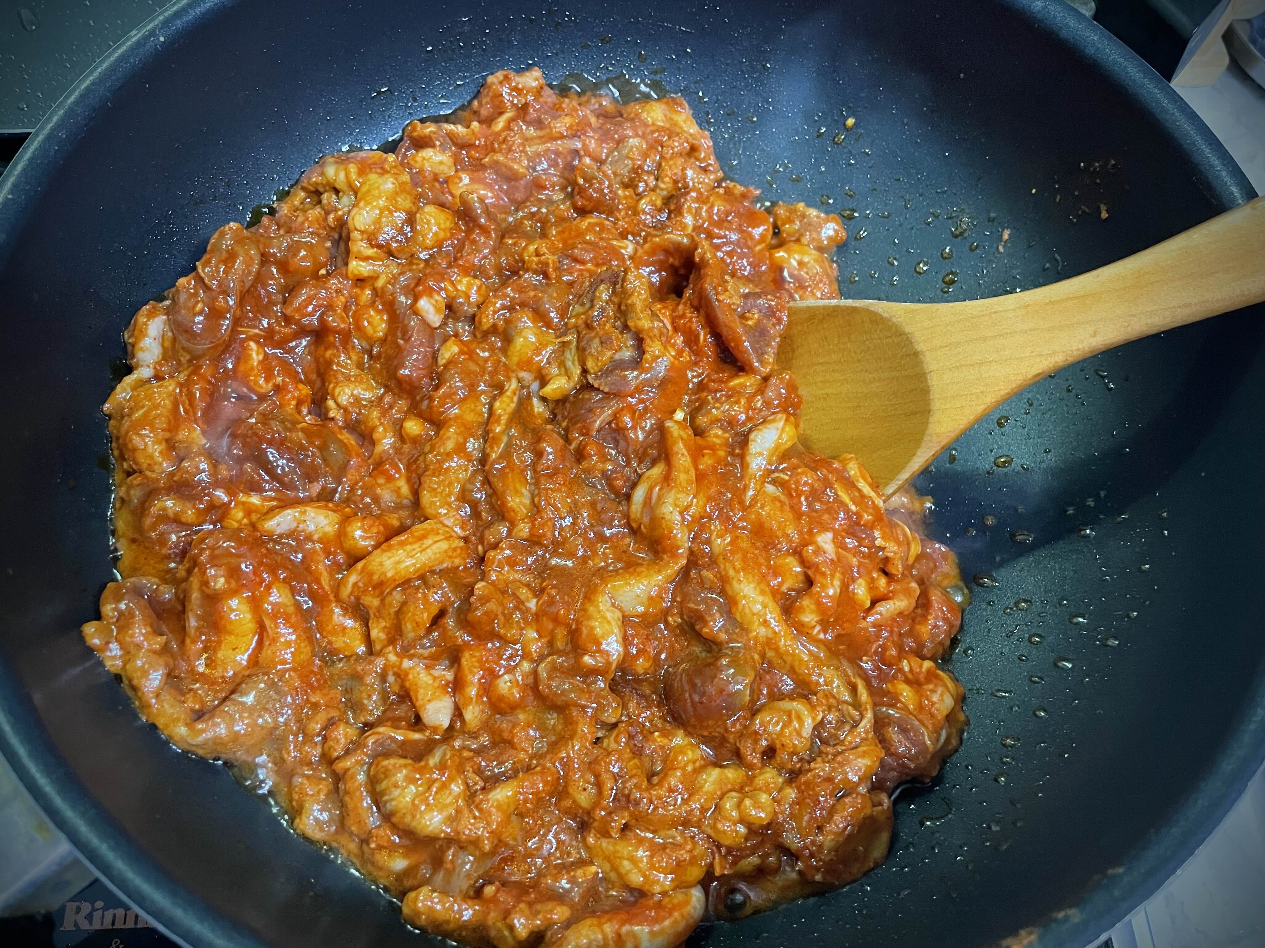 조리하기 간편하게 매콤한 양념고기로 준비했어요.