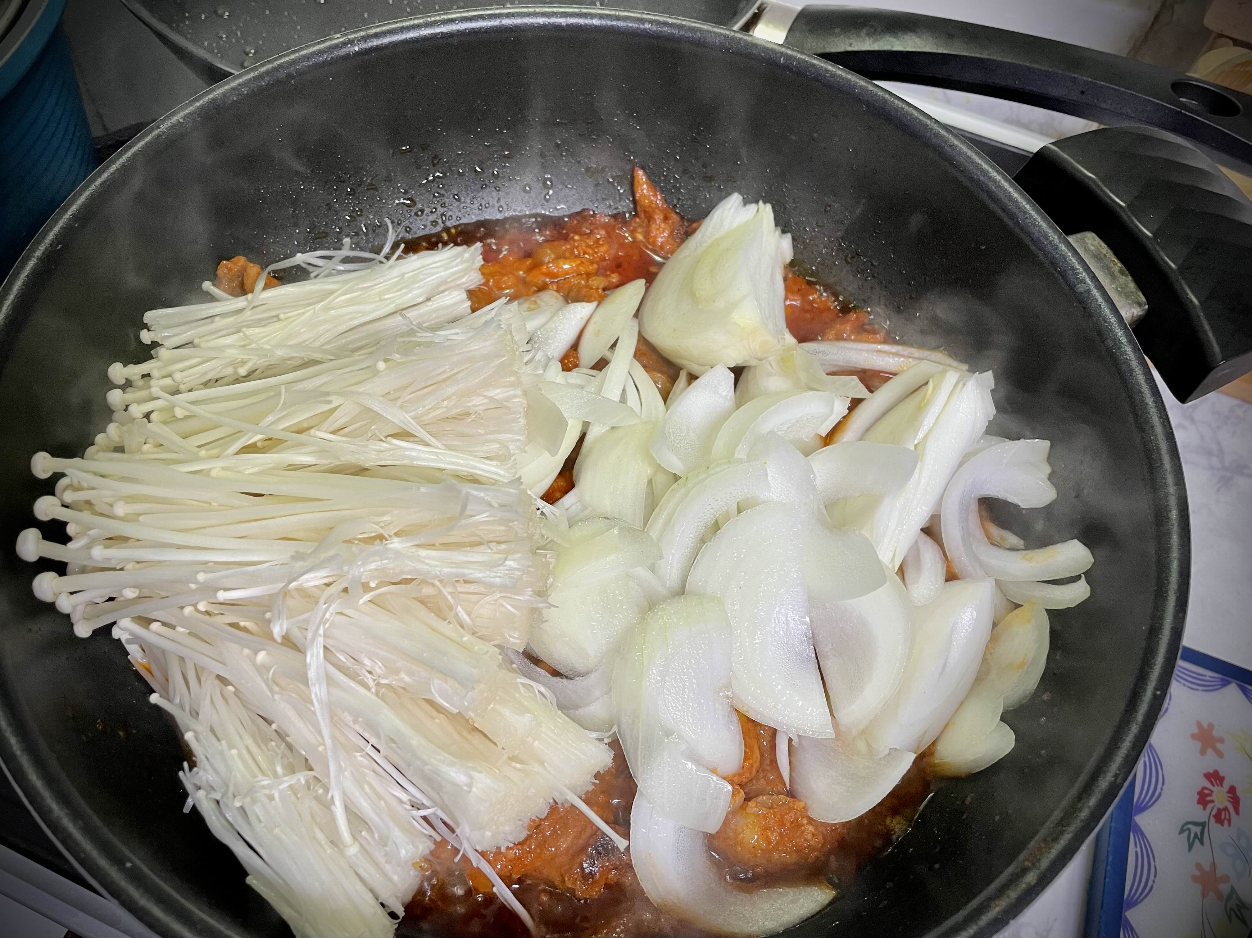 어느 정도 고기가 익었다 싶으면 준비해둔 양파와 팽이버섯을 넣고