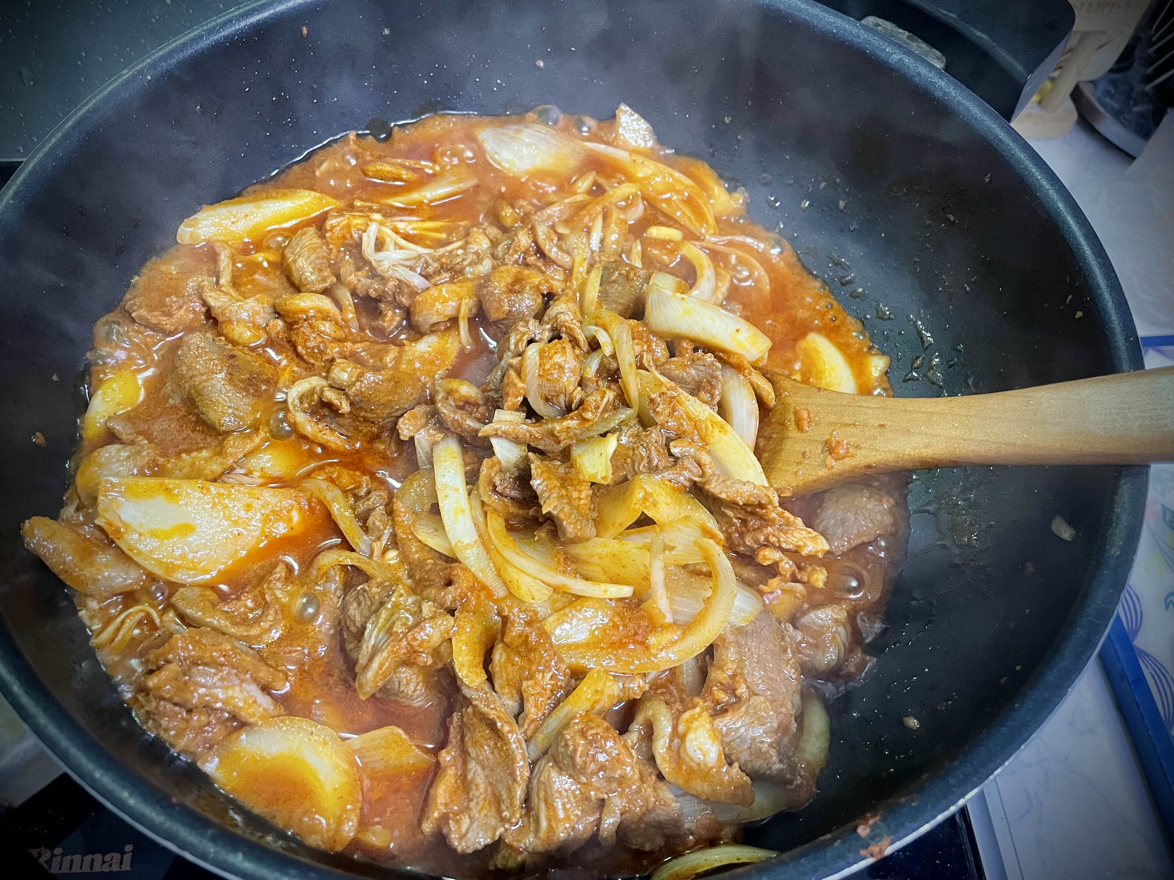 양파에서 수분이 나와 물이 많아졌습니다.
