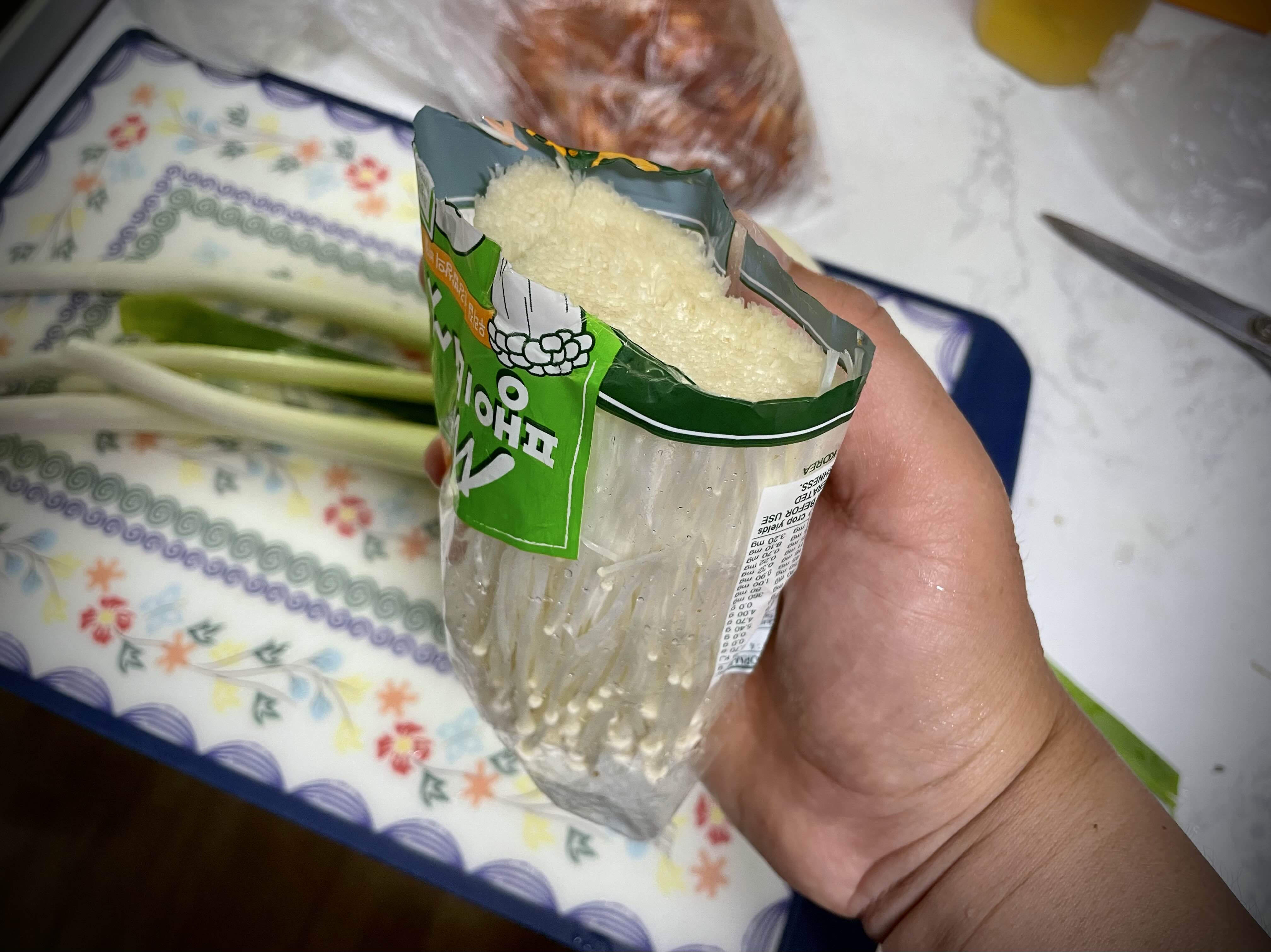 팽이버섯은 가위로 밑둥을 과감하게 잘라준 뒤 세척하시면 좀 더 편합니다.