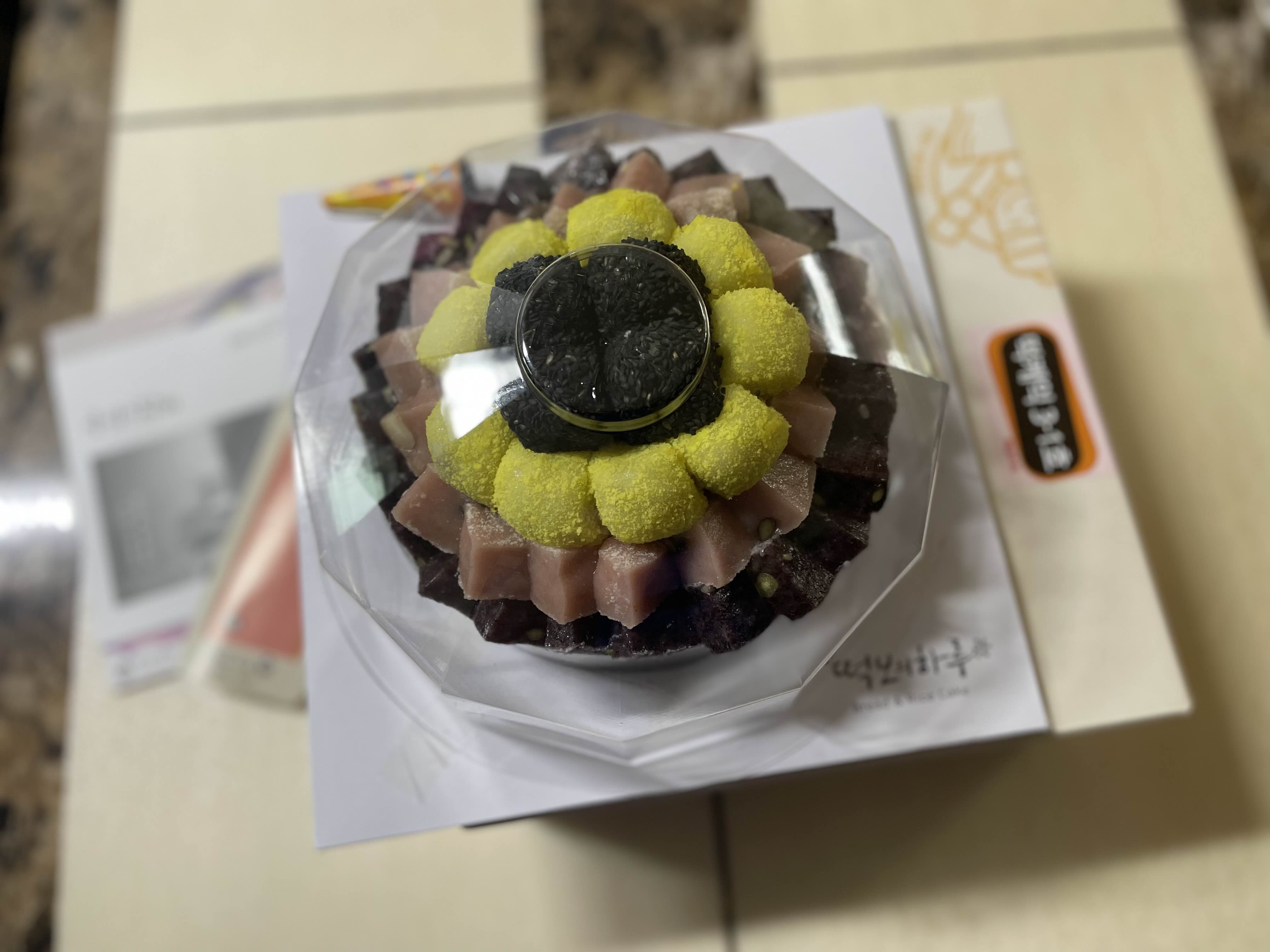 상단에는 흑깨경단 4개, 노랑경단 9개, 딸기찰떡, 흑미찰떡이 있구요.
