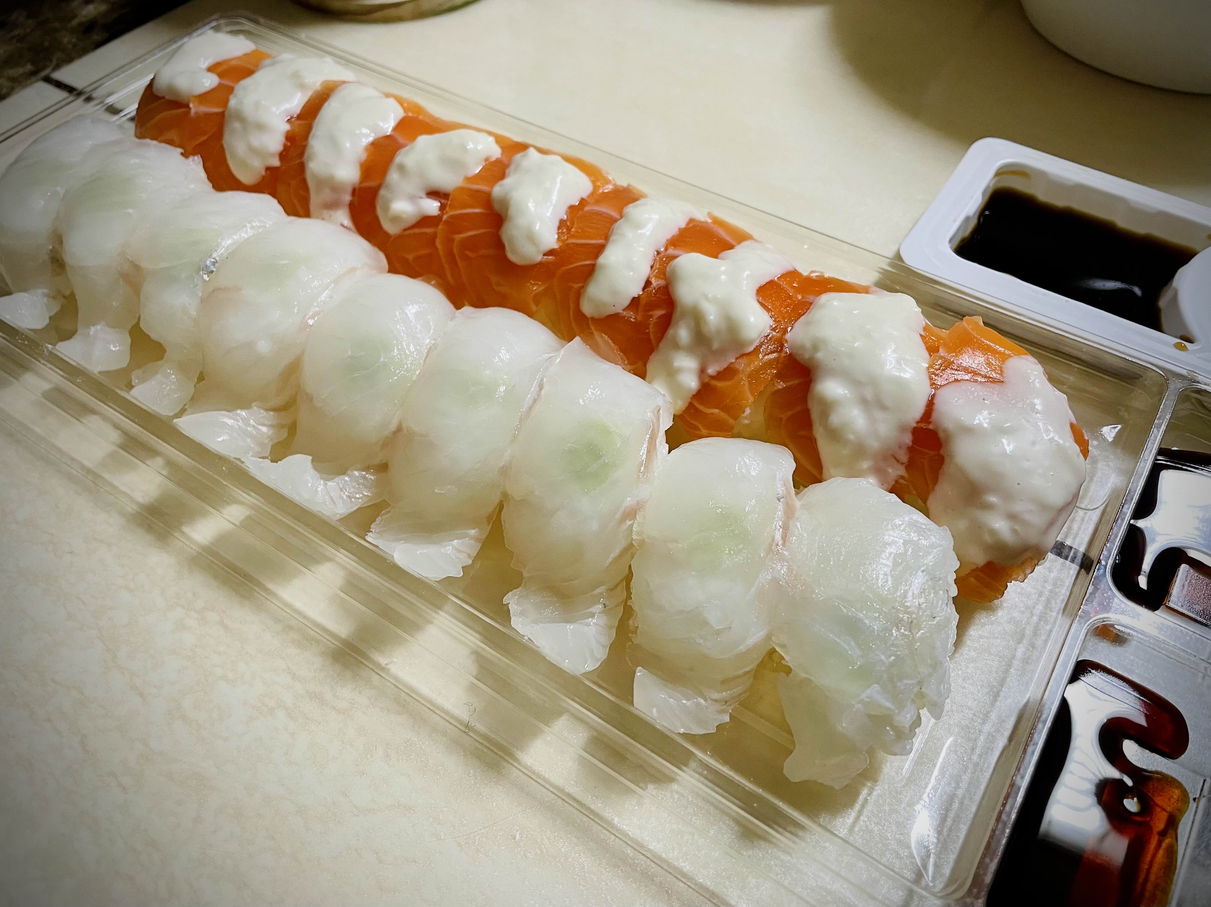 그리고 연어와 광어 초밥도 사왔는데요.
