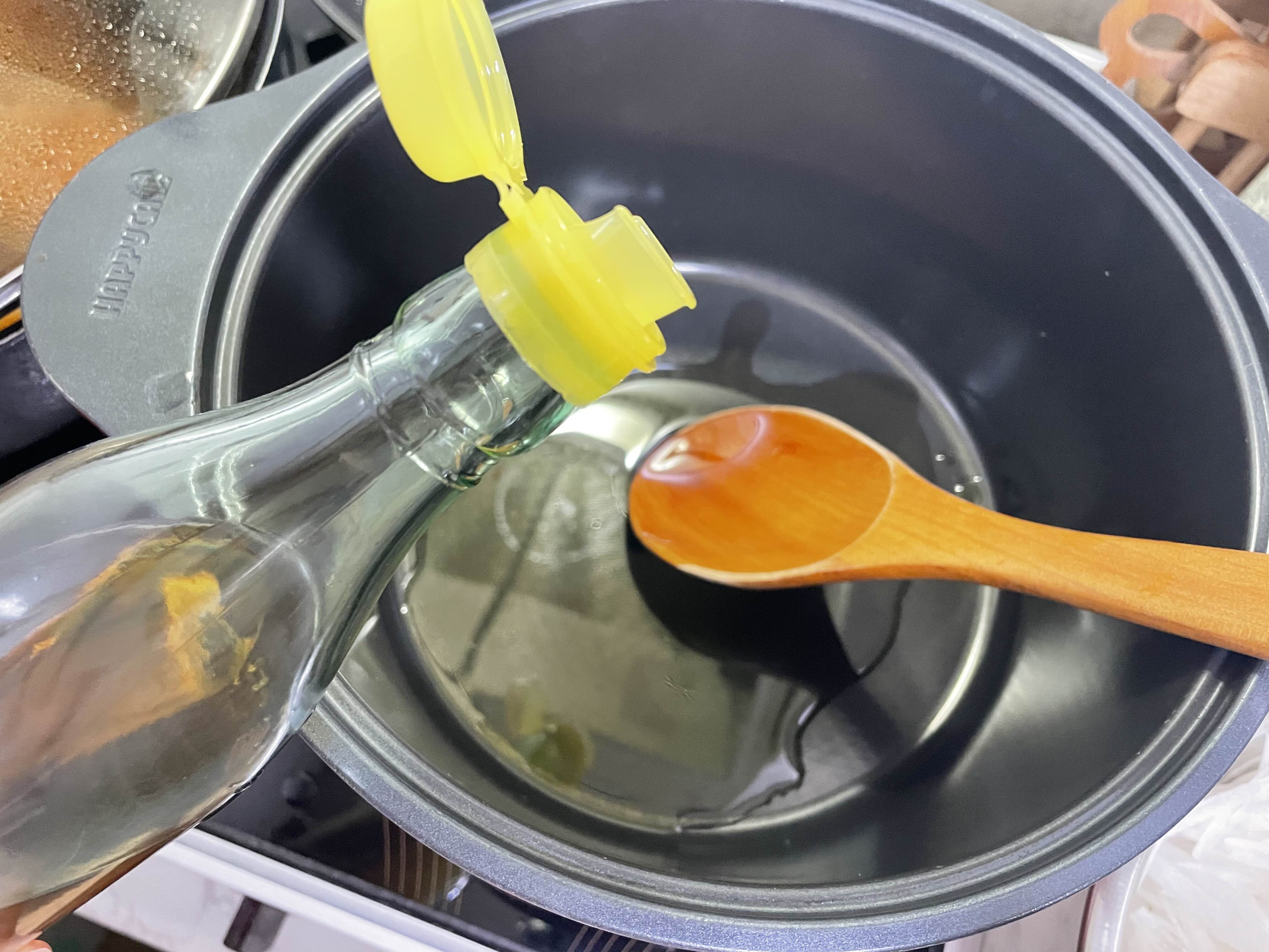 2. 냄비에 불을 올려 살짝 달궈준 후 참기름(3)을 둘러줍니다.