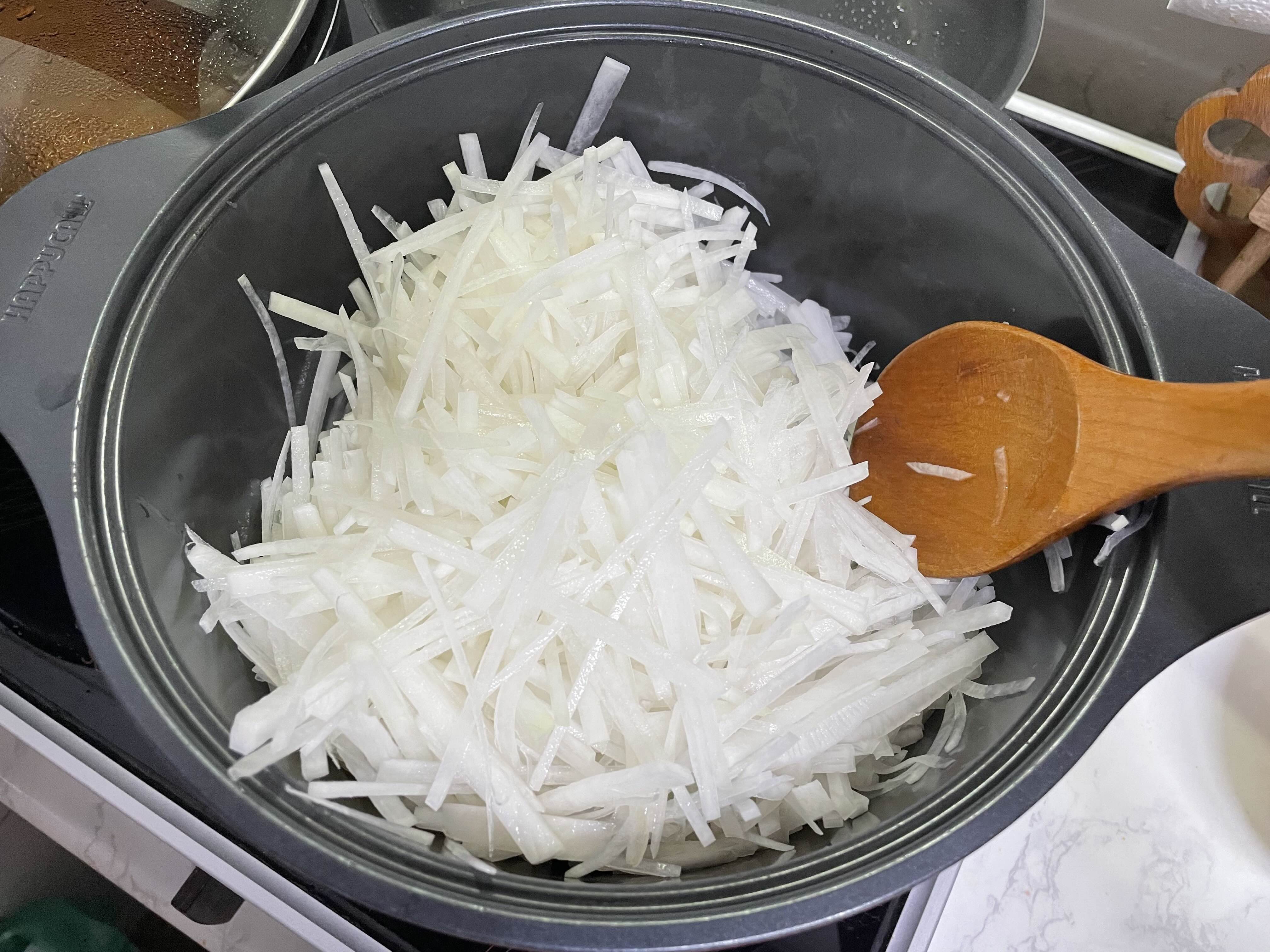 3. 썰어둔 무채를 넣고 중약불에서 뒤적뒤적 익혀 줍니다.