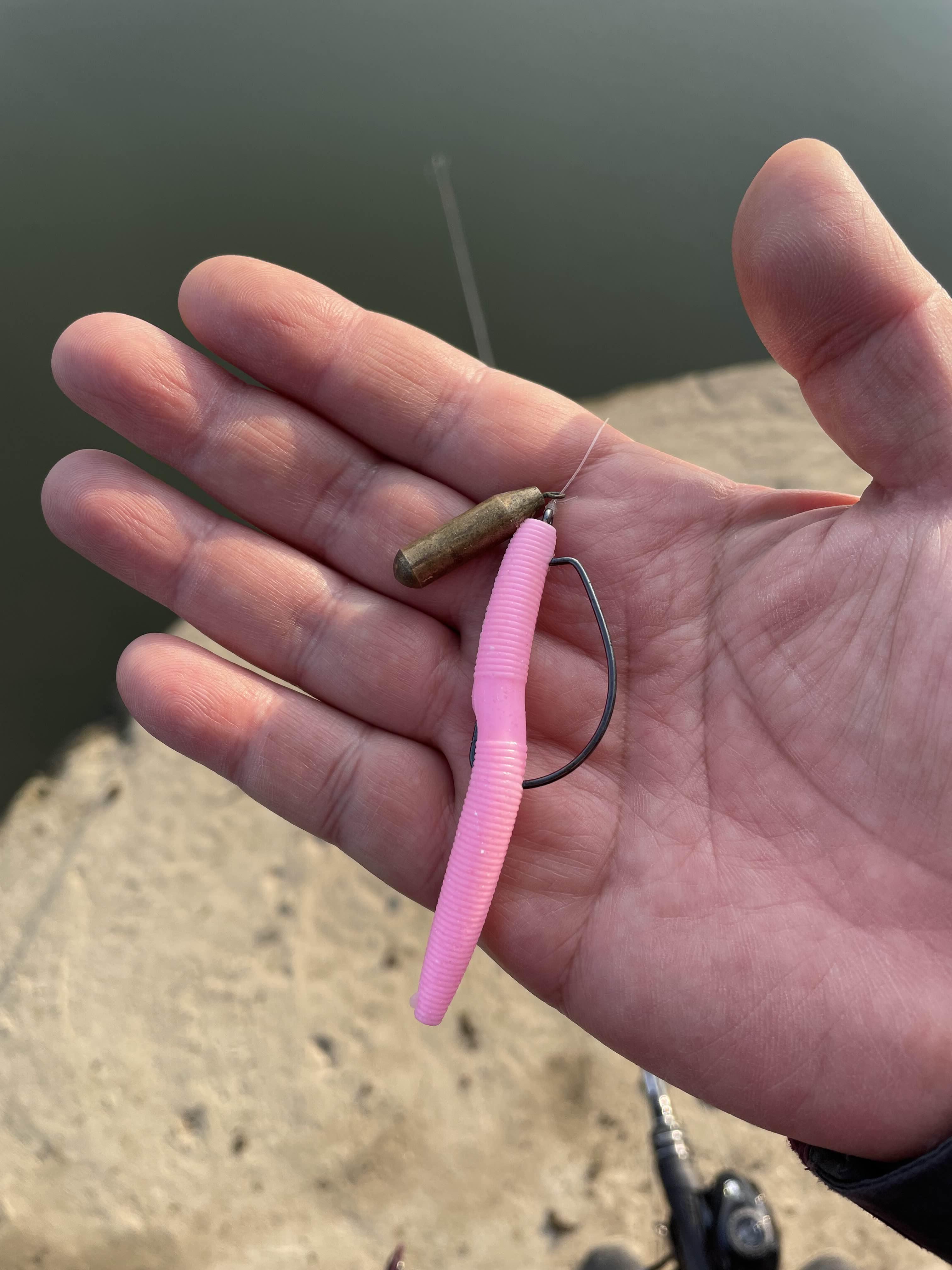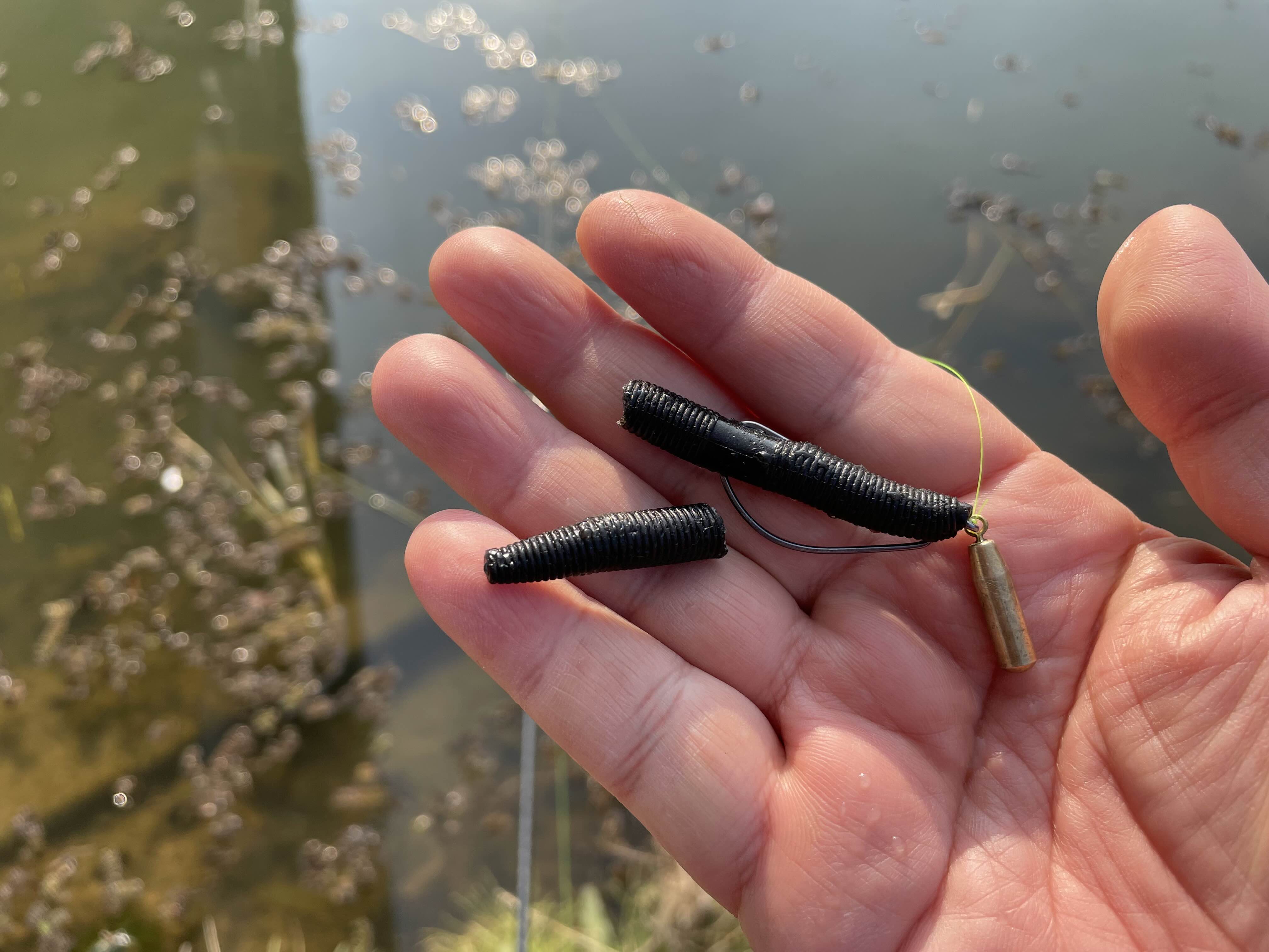 웜을 잘라 사이즈는 작게 하고, 바늘을 웜의 2/3 정도 위치까지 오도록 해서,