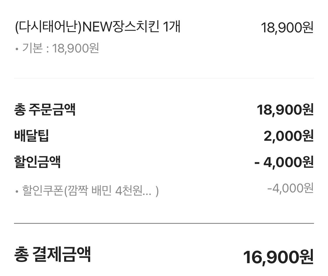 New장스치킨이 보이길래 쿠폰할인 먹여서 16.9 천원에 주문했습니다.