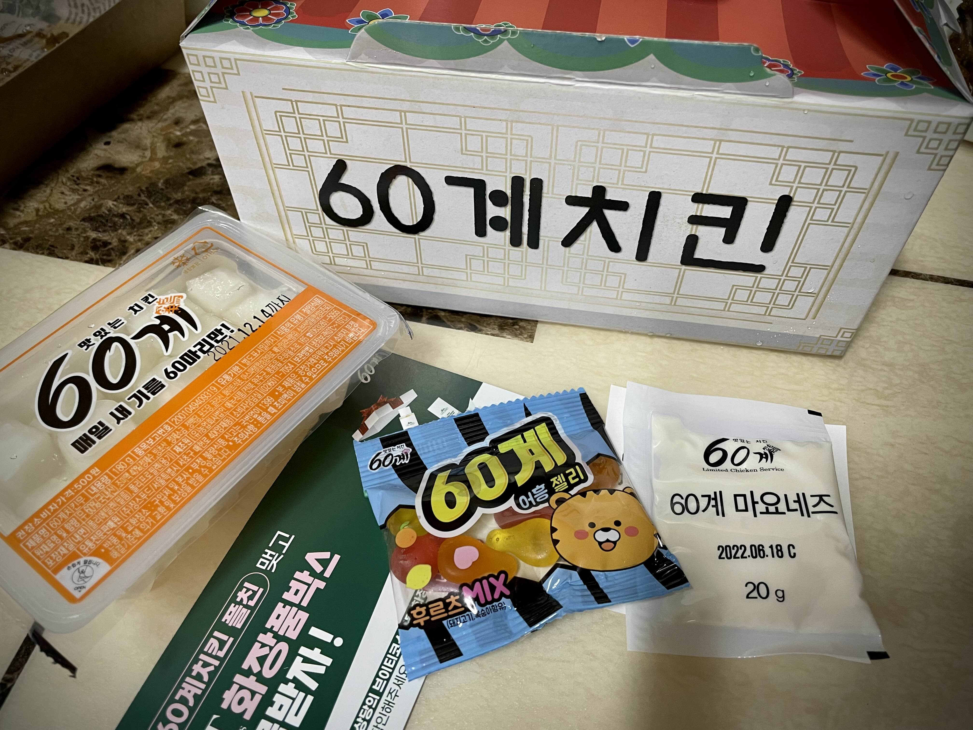 네 식구가 이거 하나로는 양이 차지 않아 60계치킨에서 한 마리를 더 주문하였습니다.
