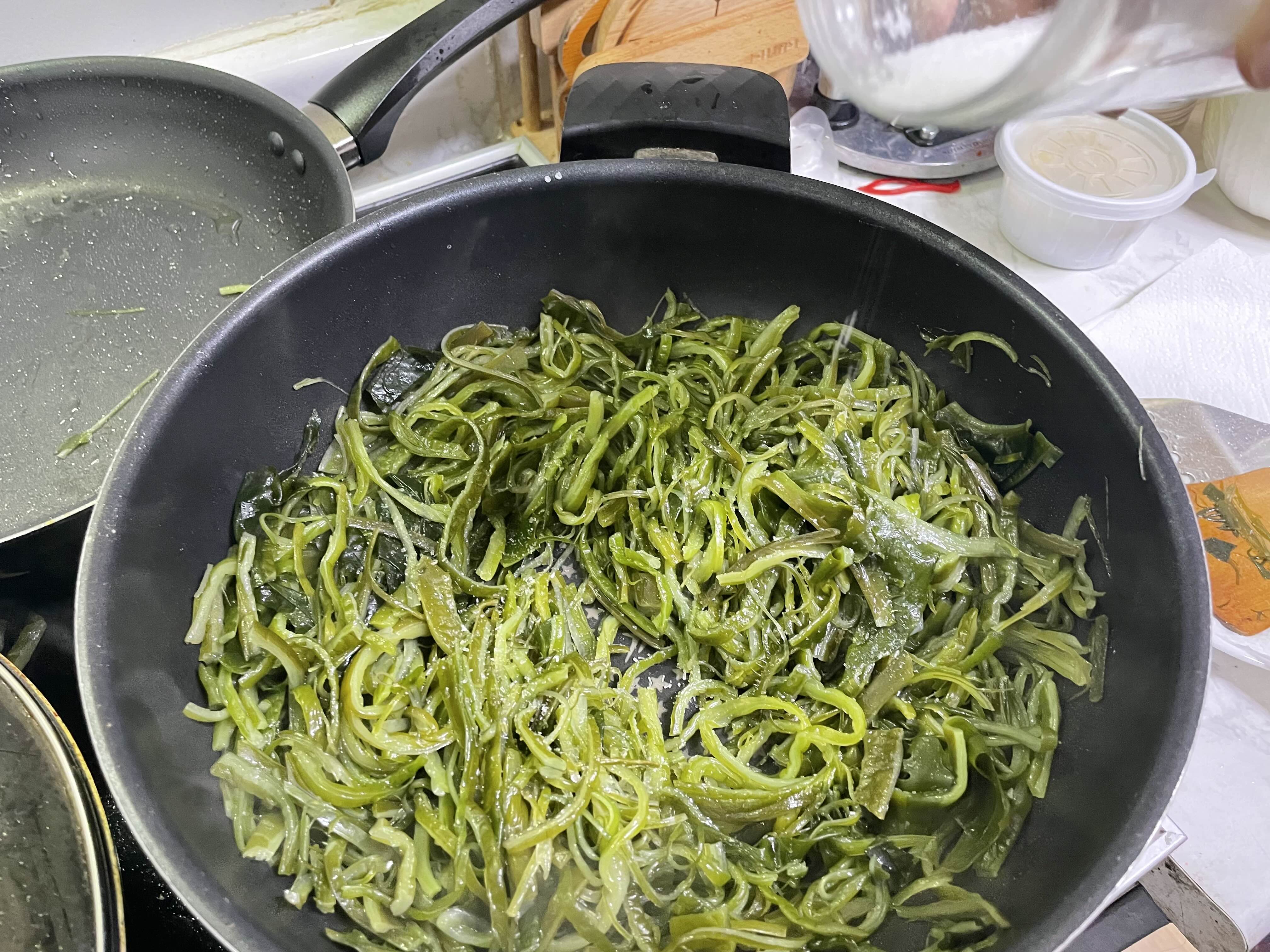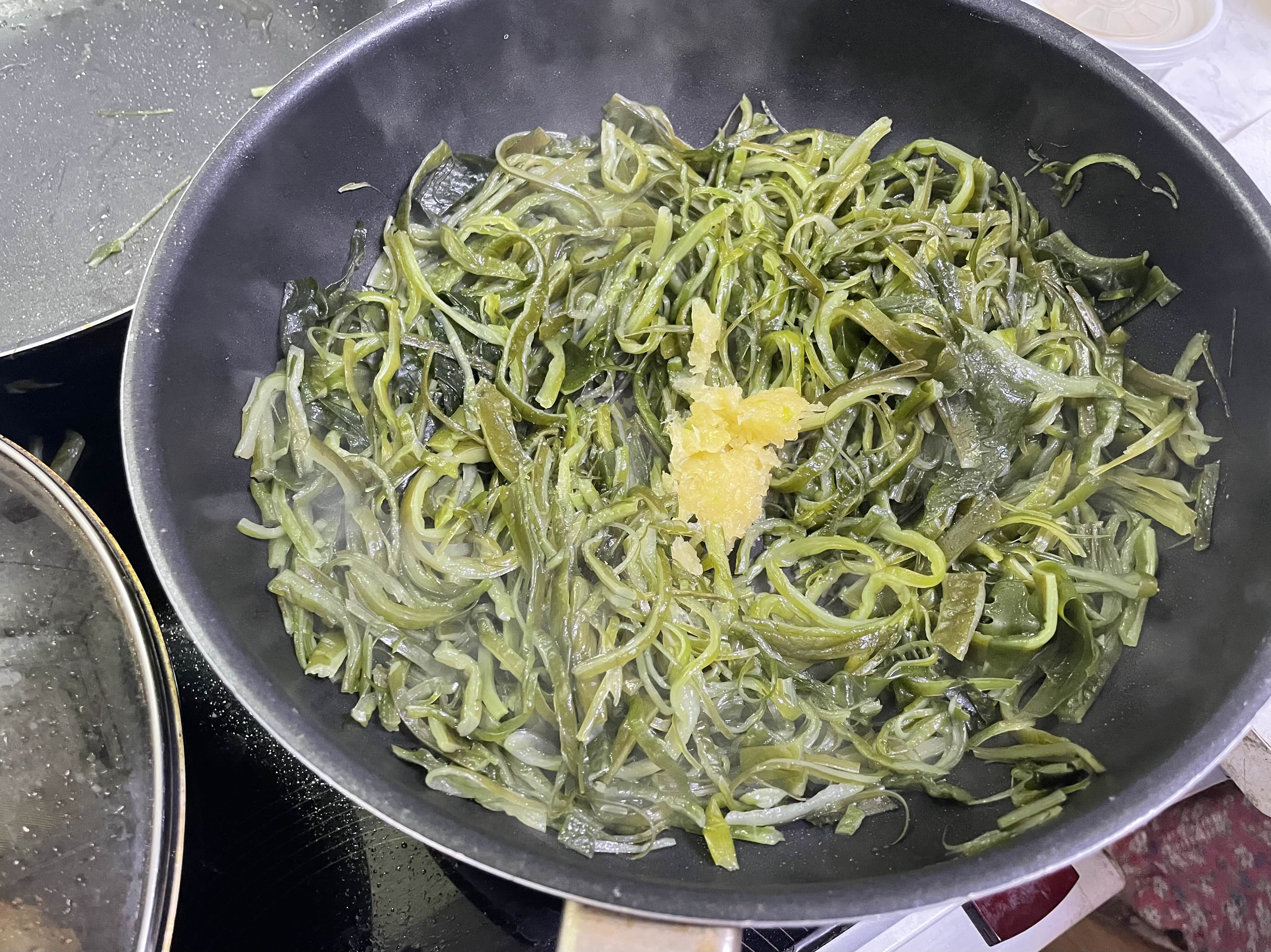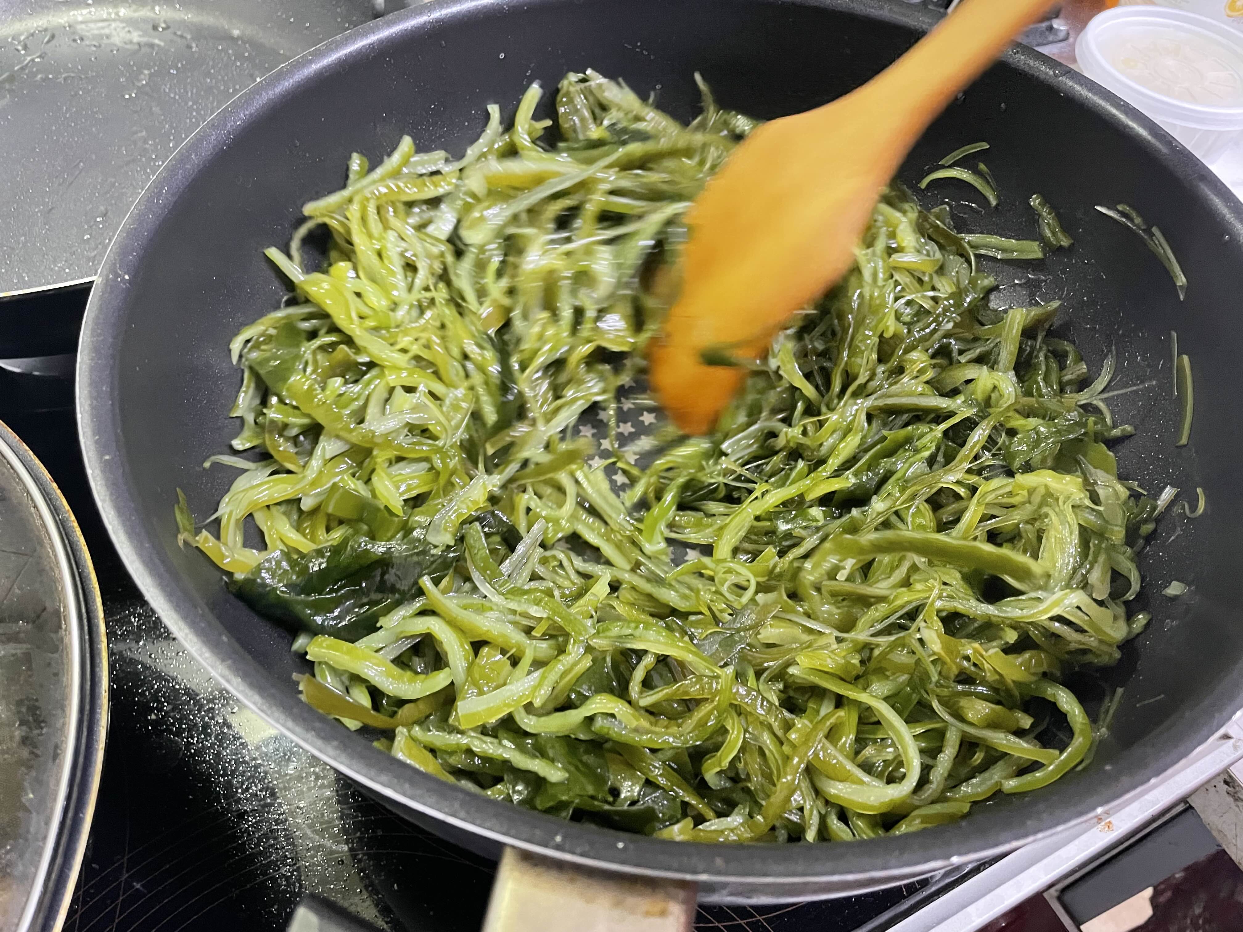 5. 미역줄기를 넣고 손이 안 보일 정도(?)로 휙휙 볶아줍니다. (사실 손 좀 보여도 됩니다)