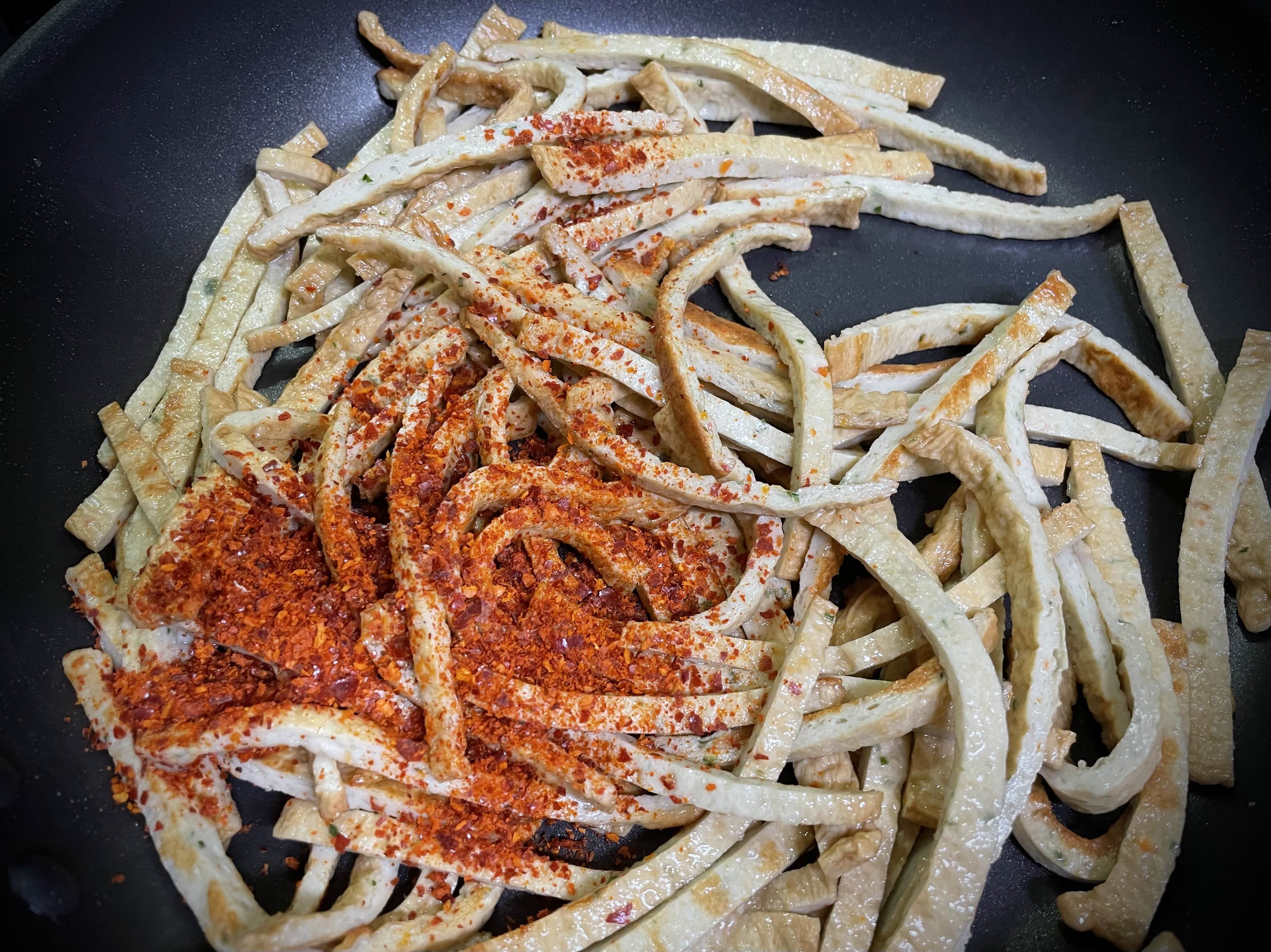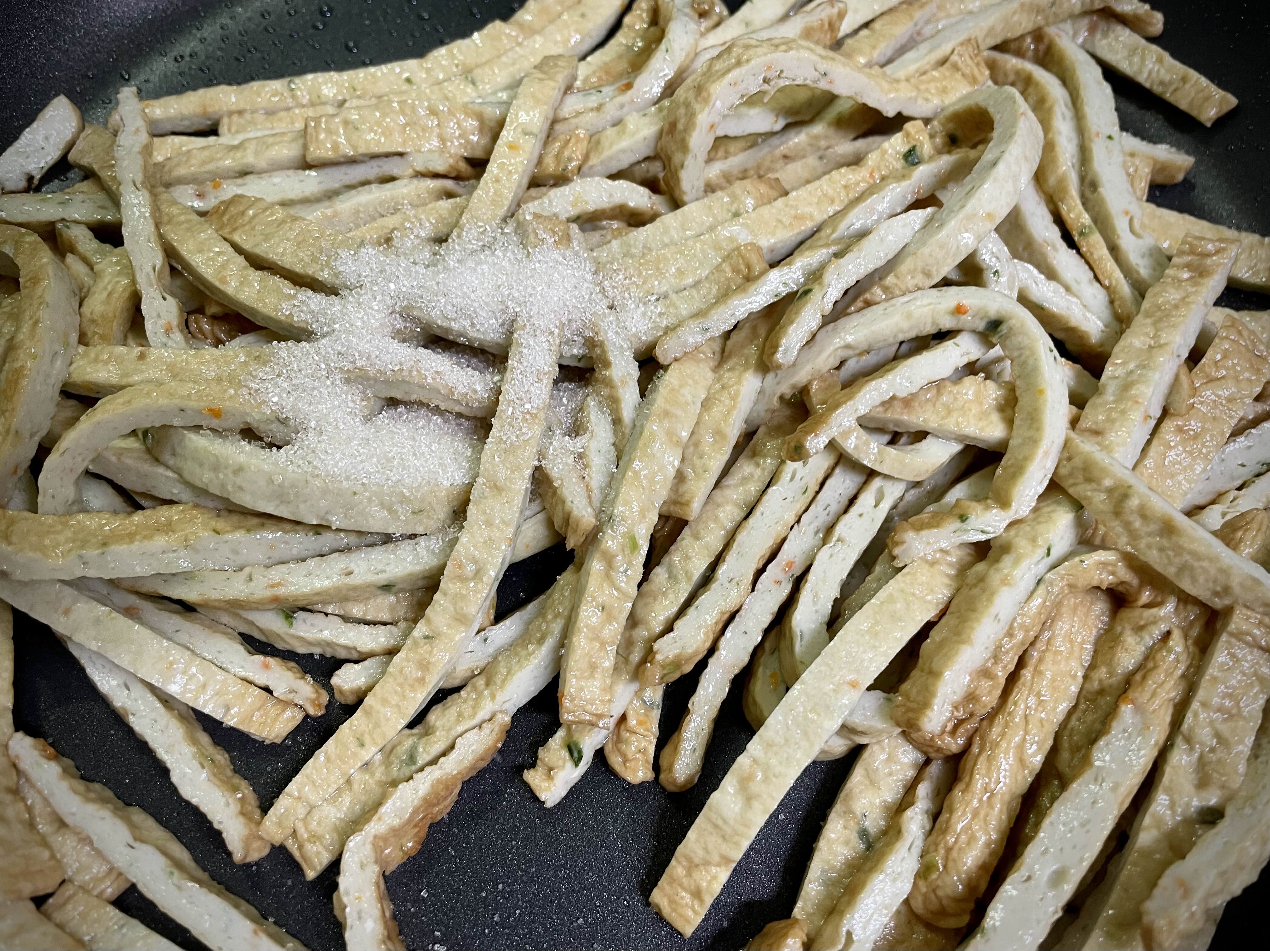 4. 팬에 식용유(3)을 두르고 어묵을 볶다가 설탕(1), 고춧가루(1), 간장(2), 다진 마늘(1.5)을 넣고 빠르게 볶아줍니다.
