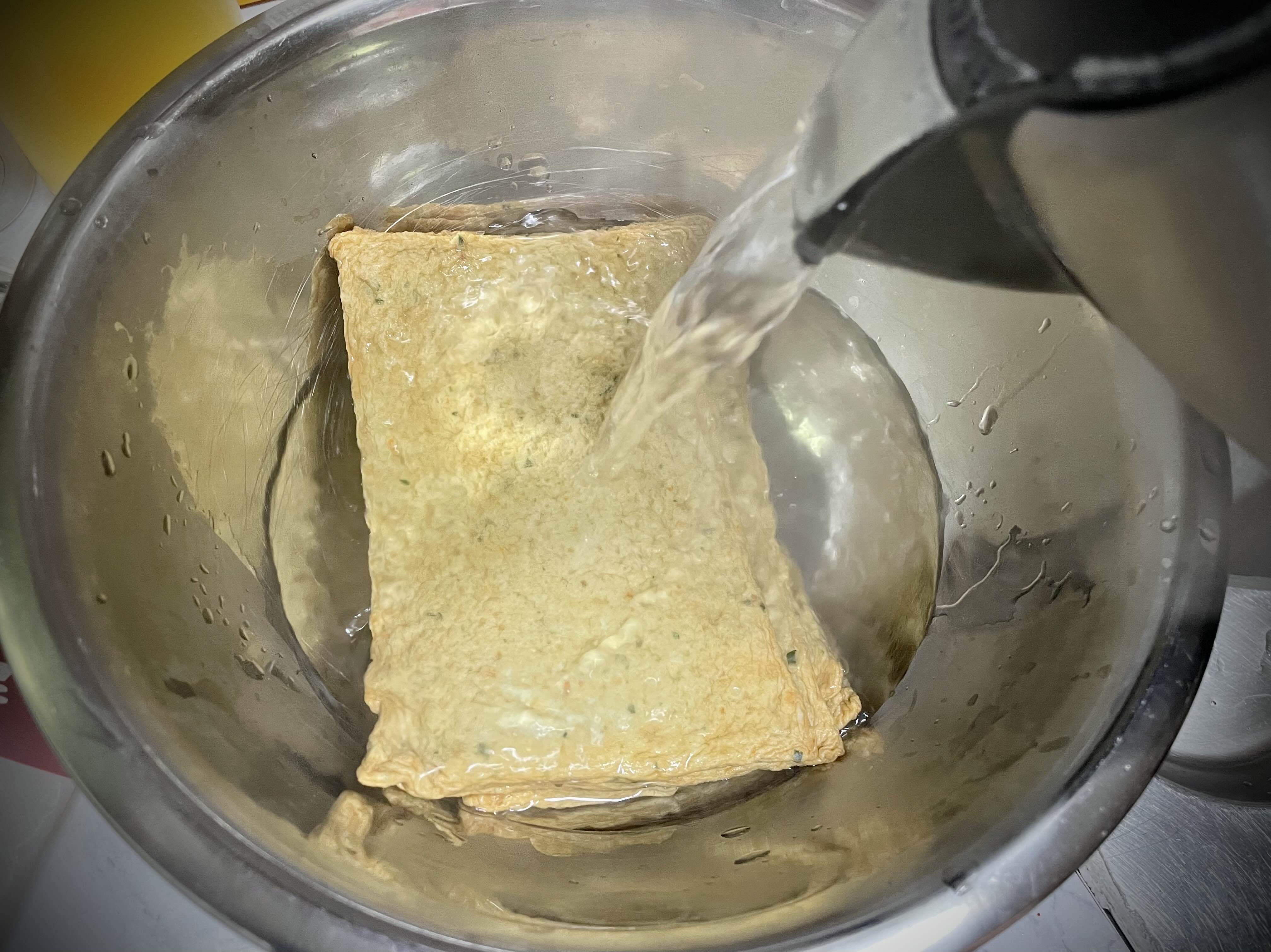 2. 어묵은 끓는 물에 살짝 데치거나, 커피포트에 물을 끓여서 뜨거운 물을 부어 줍니다.
