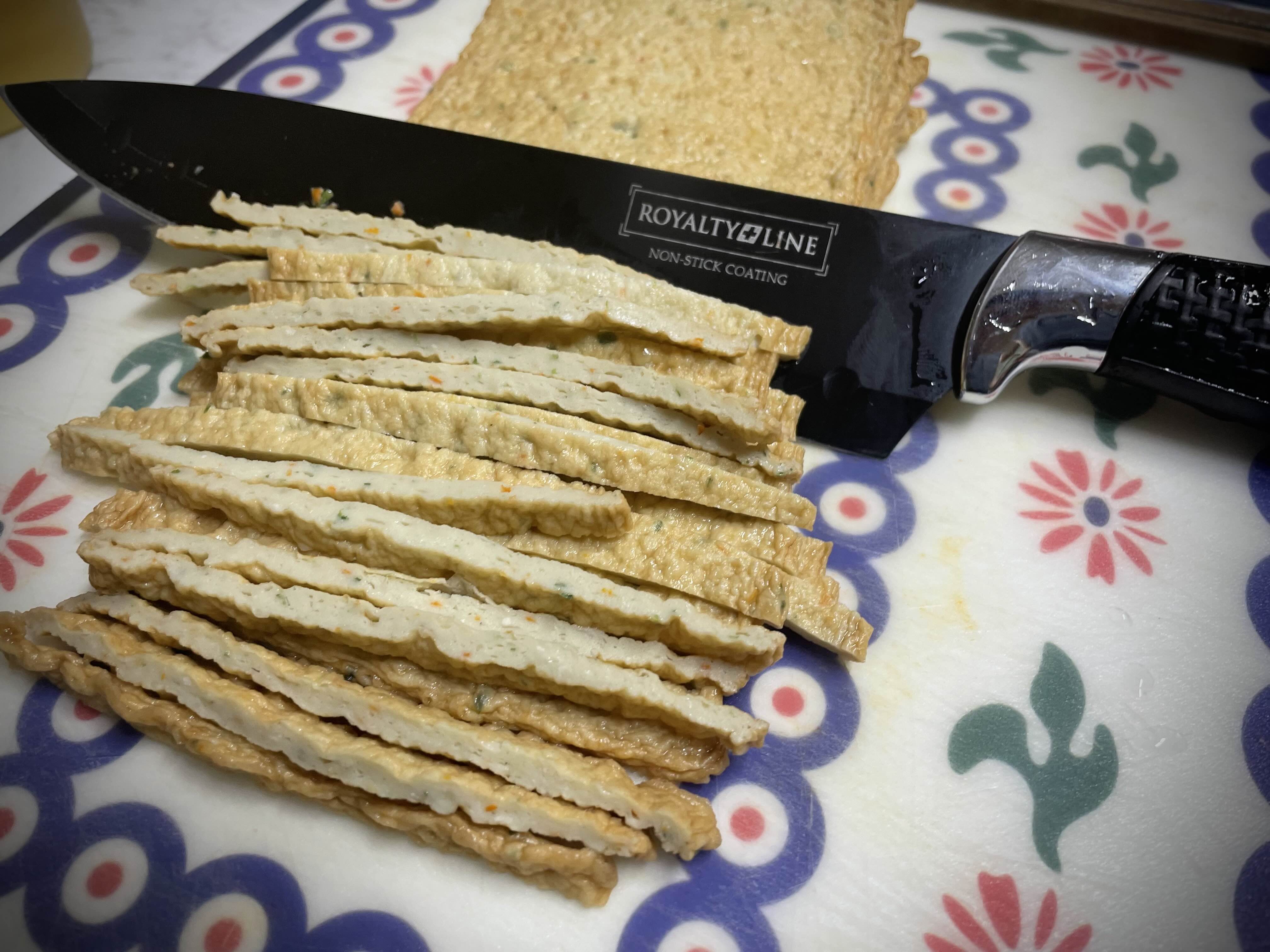 3. 데친 어묵을 채 썰듯이 총총 썰어주세요.