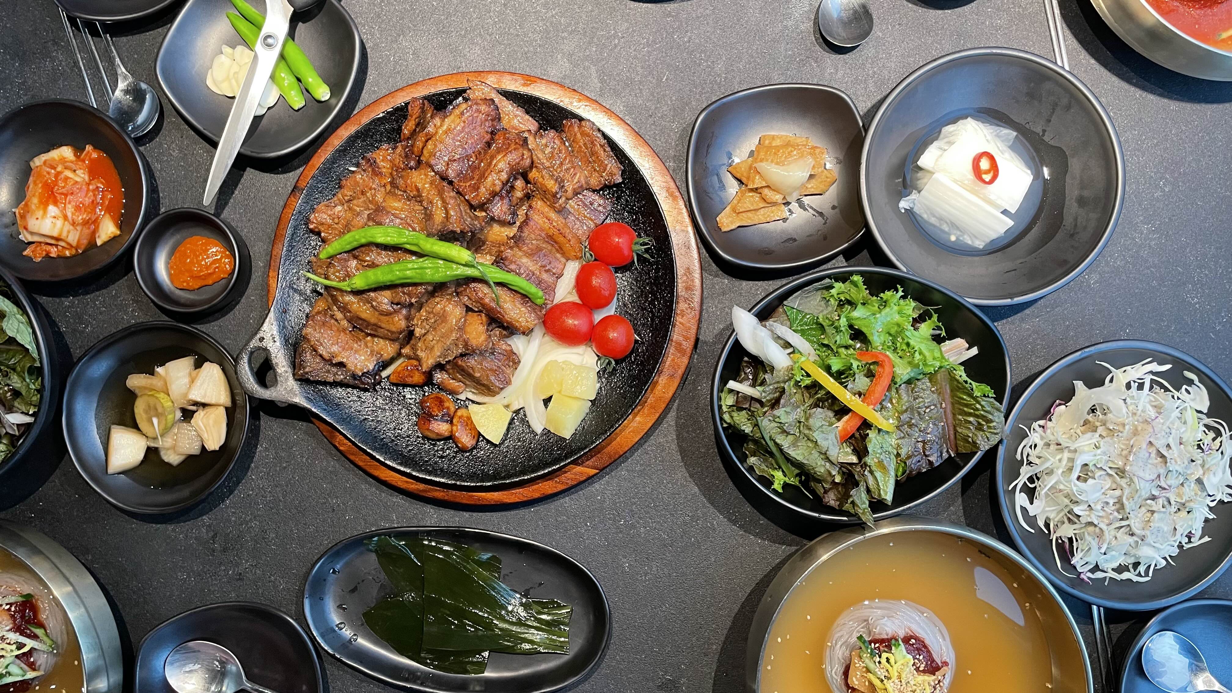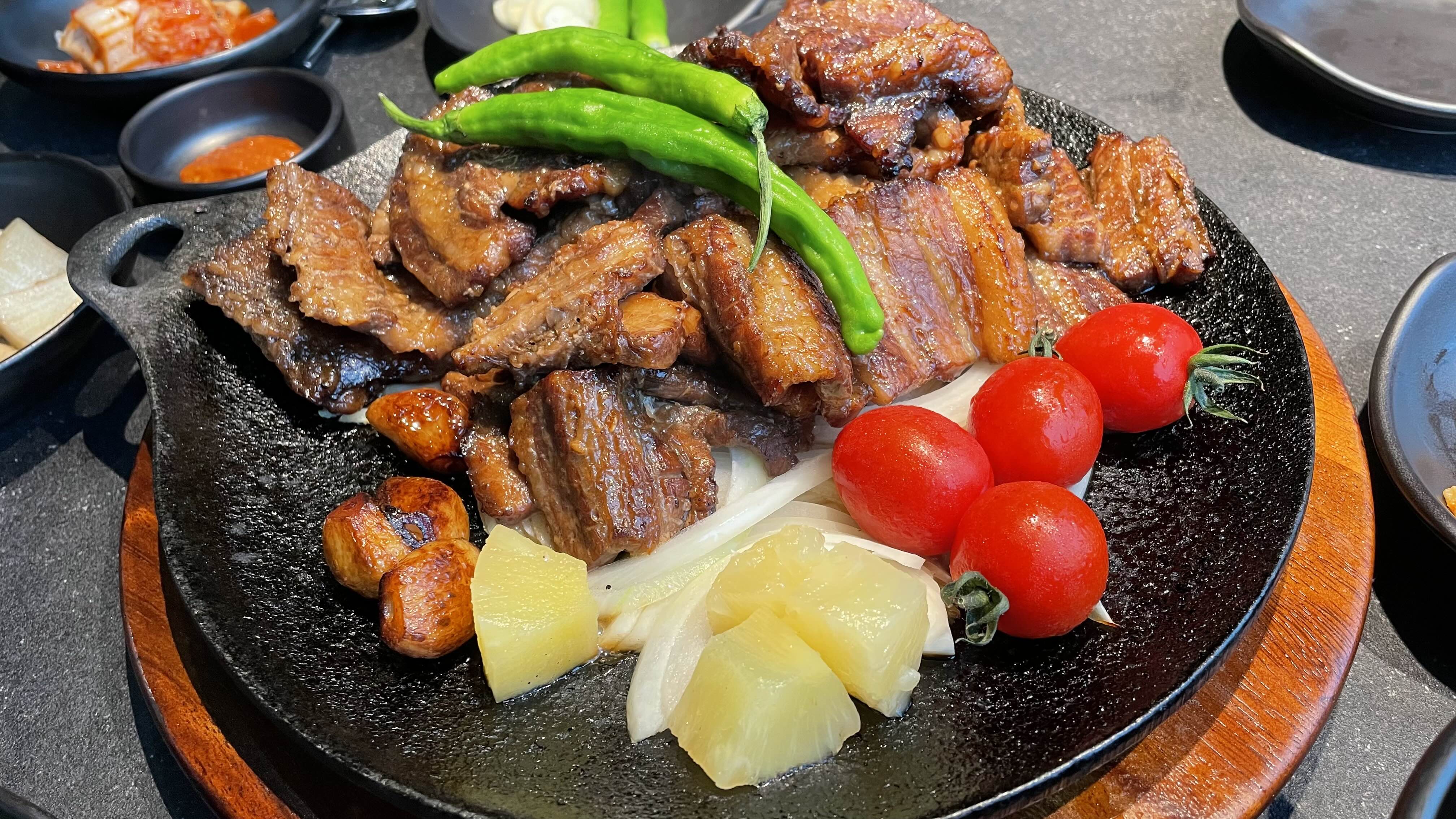 메인 음식인 돼지갈비 위로 정확히 조명이 내려와
