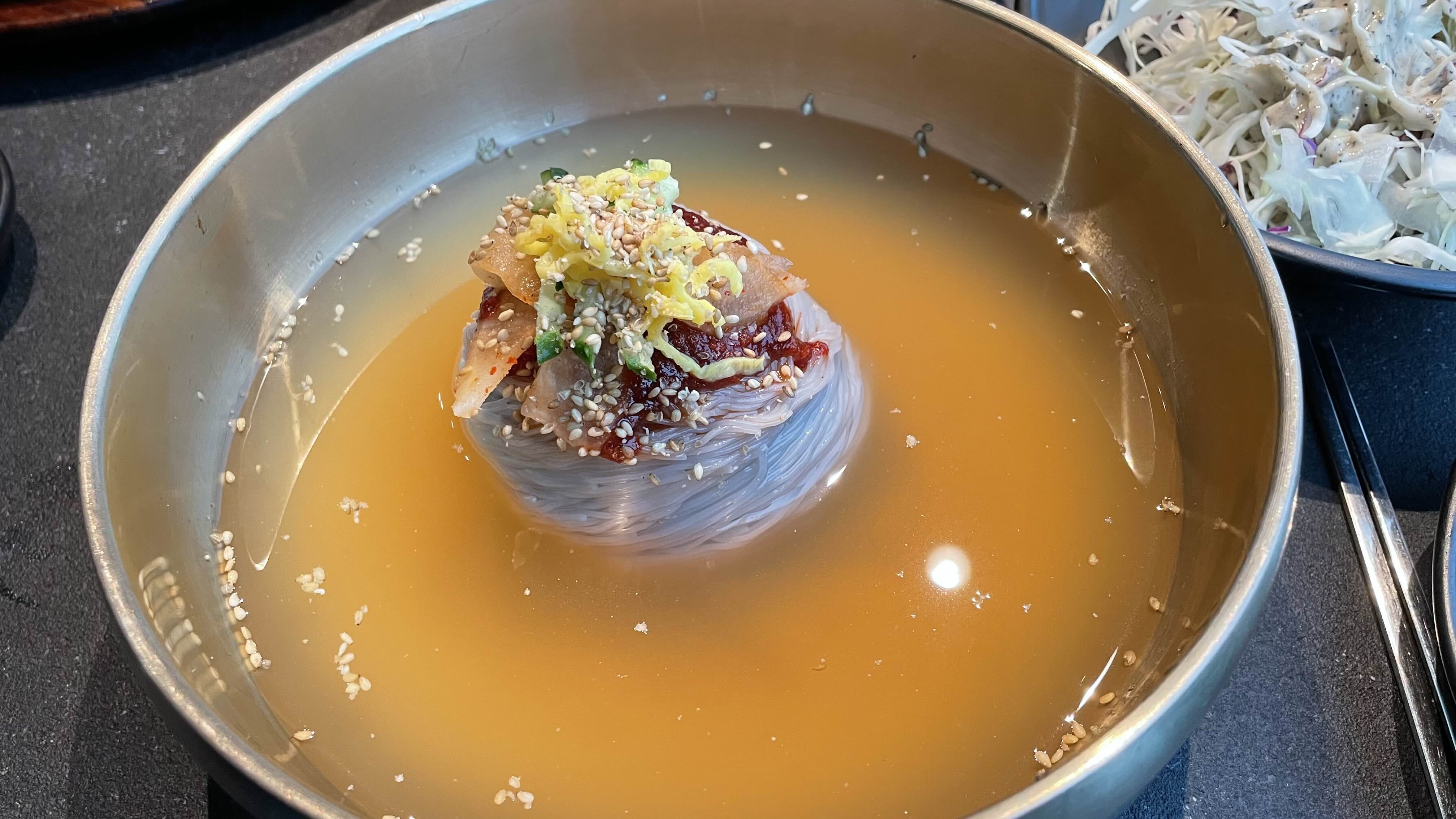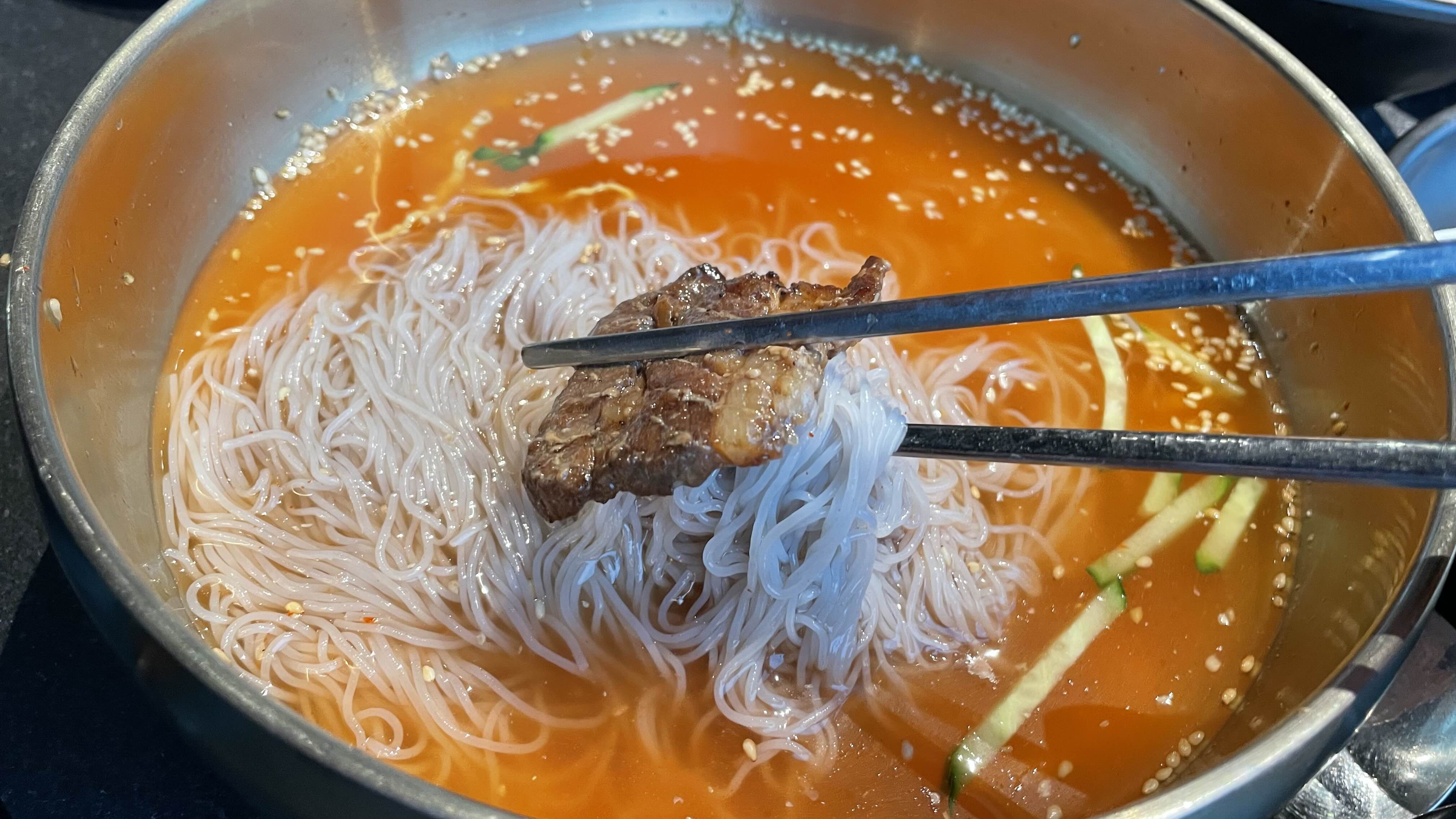 물냉에 고기 한 점 올려서 후루룩…